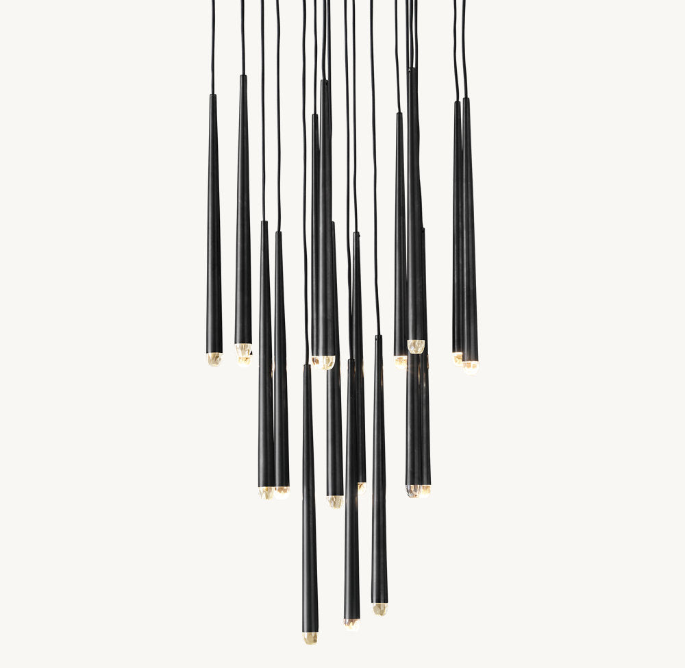 Inspired by French minimalist lighting of the 1960s, Jonathan Browning's elegant design features a cluster of solid brass forms suspended from slender black cords. Inset LEDs at the faceted glass tips offer warm, glowing light.