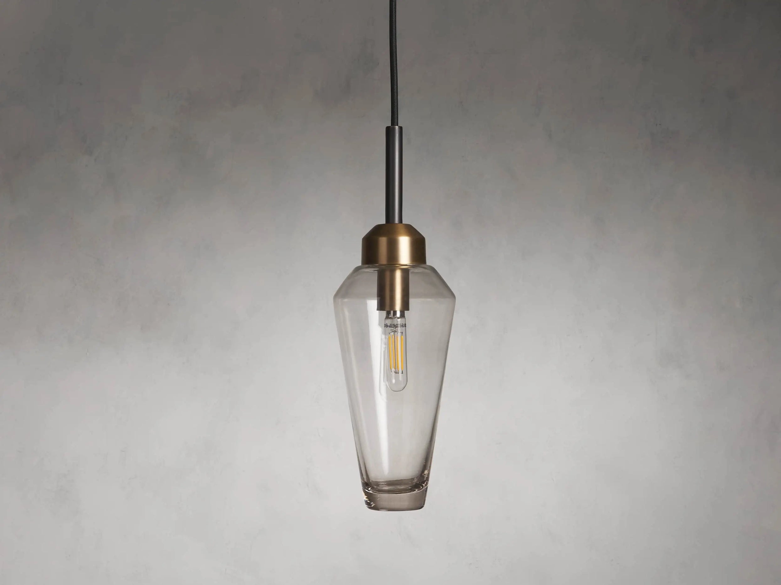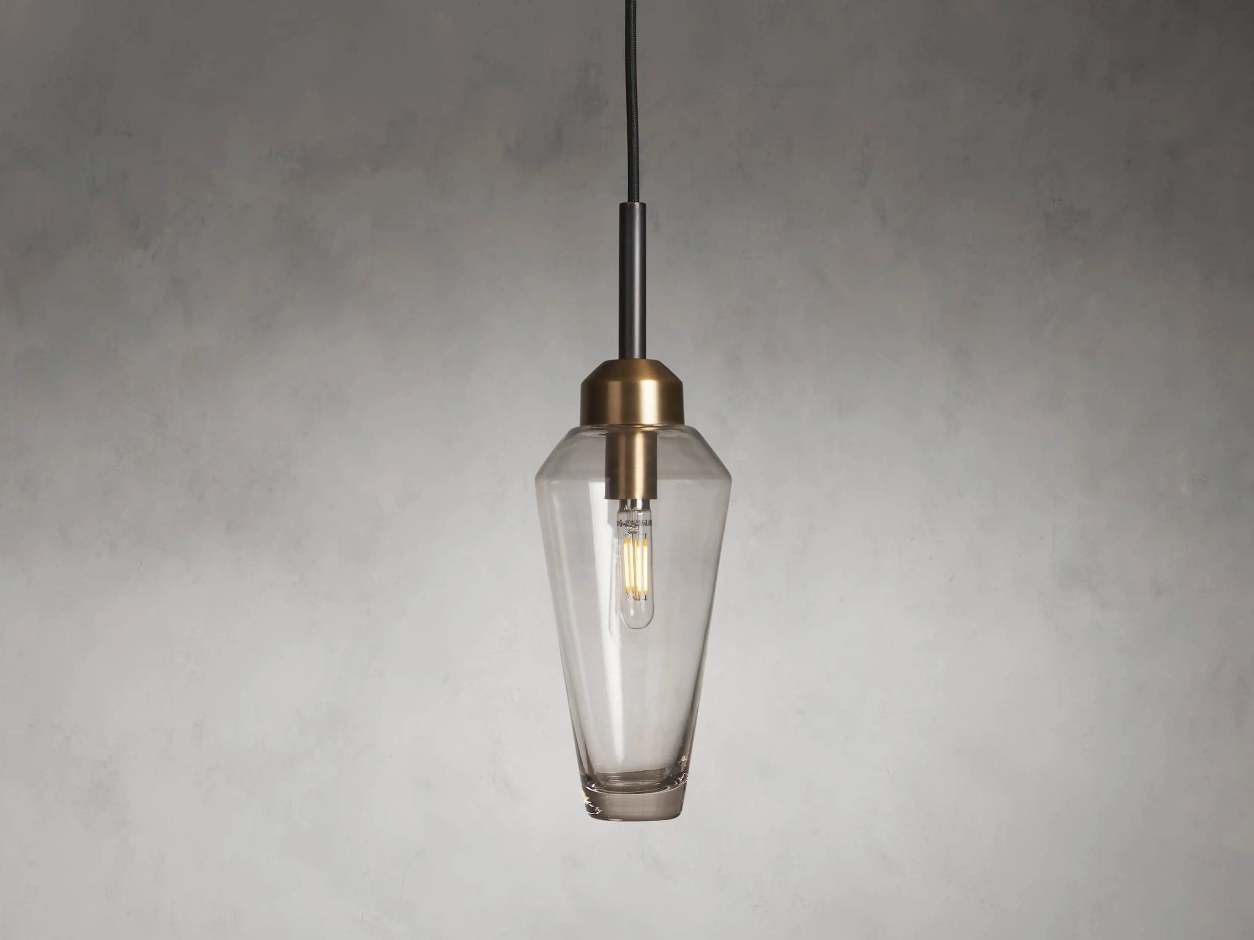 With dense, mouth-blown glass living harmoniously with burnished-brass accents, the striking silhouette of our Arrow Bronze Pendant creates a perfectly asymmetrical yet linear design.