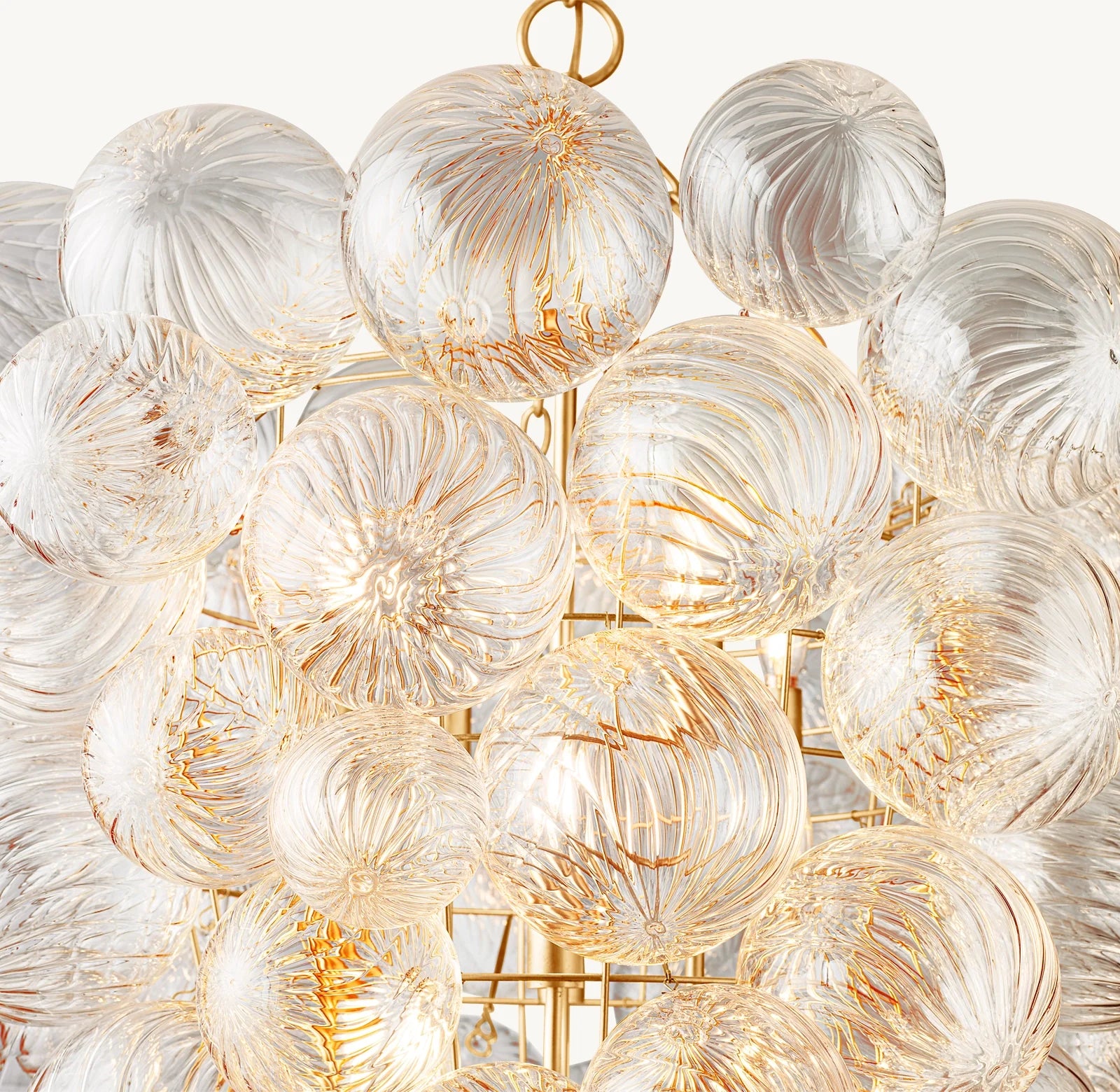 Bright and lively, the Talia Collection chandelier features an elegant chain suspension. Below is a minimalist frame that secures the fixture behind a cluster of shades to minimize glare. Artisans craft rotating glass globes to create a warm halo of light, revealing mesmerizingly delicate highlights