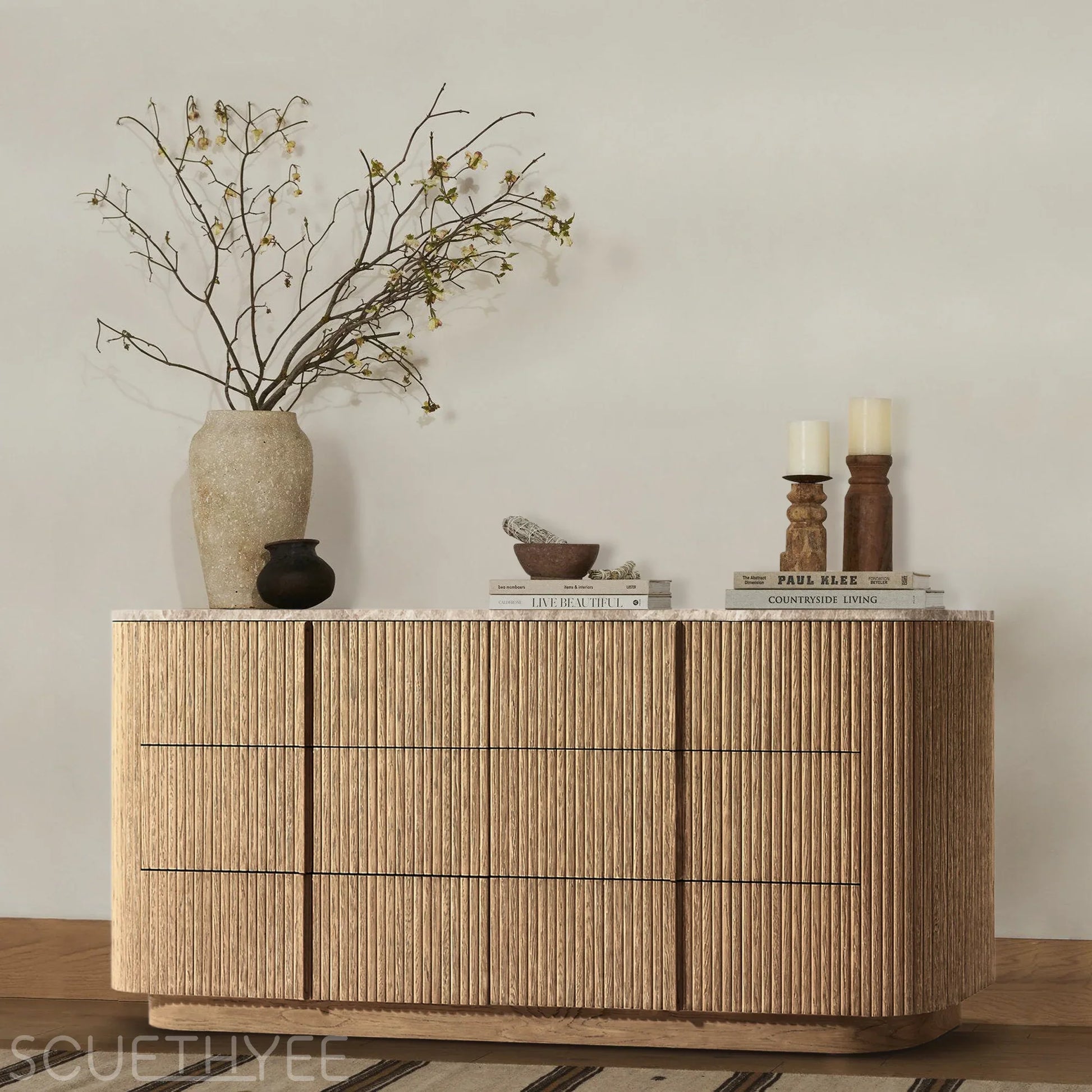 - Vertical surfaces boast solid oak reeding, adding depth and texture to the piece.