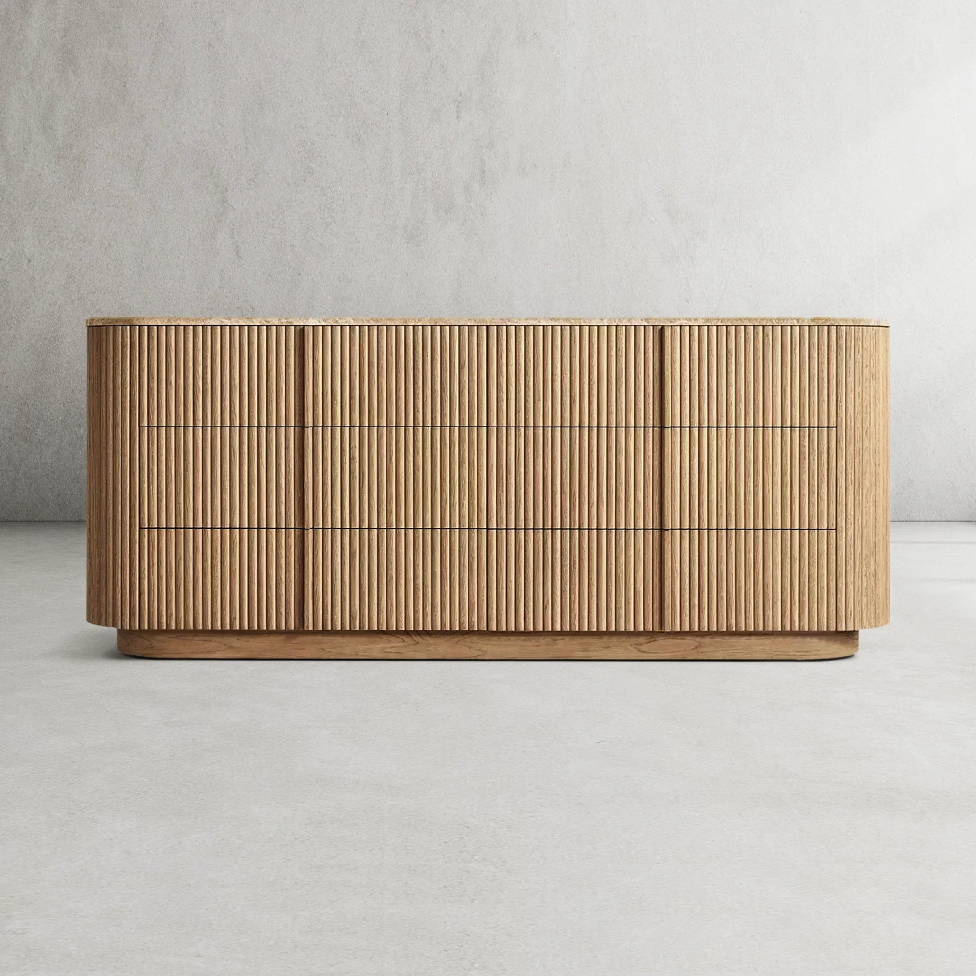 Defined by individually applied reeds of wire-brushed solid American oak, the Katrina collection is a creation by renowned designers Thomas Bina and Ronald Sasson. With gently curved radius corners that wrap seamlessly around the sides, the collection boasts a fluid, uninterrupted silhouette. The natural stone tops, with rich veining and striking color contrasts, make each piece truly one of a kind.