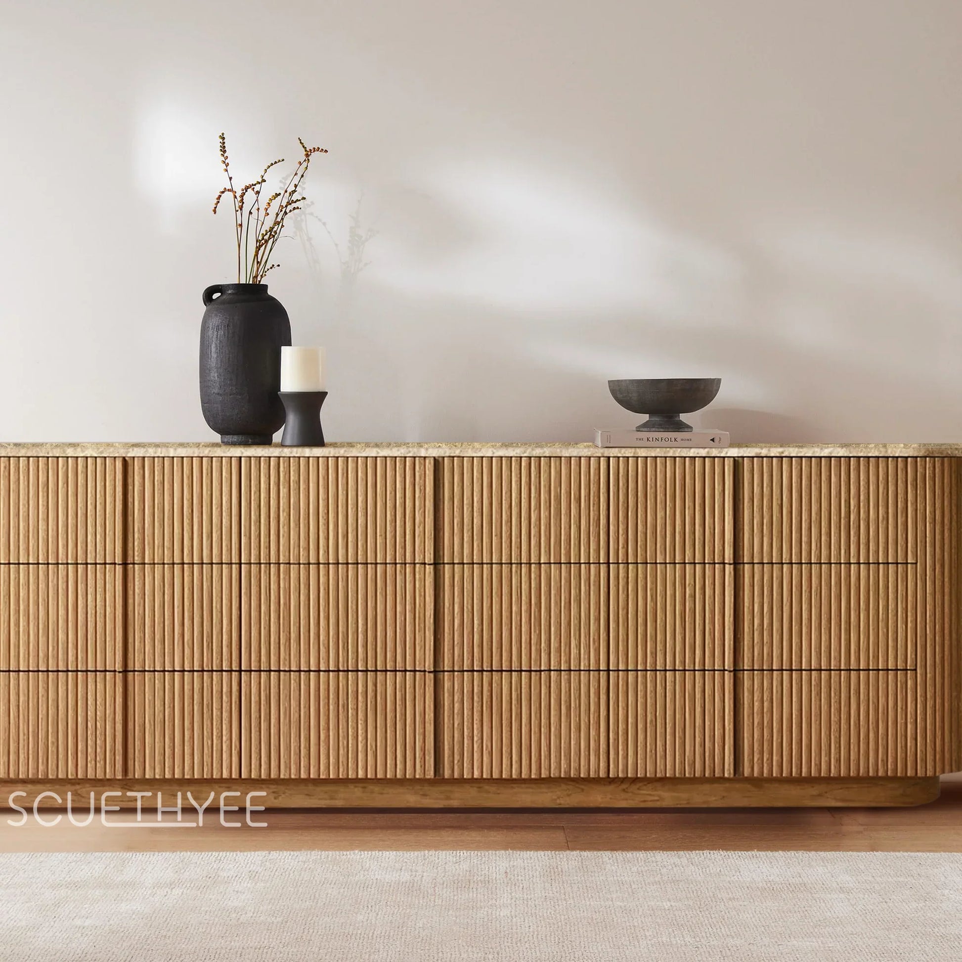 Defined by individually applied reeds of wire-brushed solid American oak, the Mulho collection is a creation by renowned designers Thomas Bina and Ronald Sasson. With gently curved radius corners that wrap seamlessly around the sides, the collection boasts a fluid, uninterrupted silhouette. The natural stone tops, with rich veining and striking color contrasts, make each piece truly one of a kind.