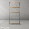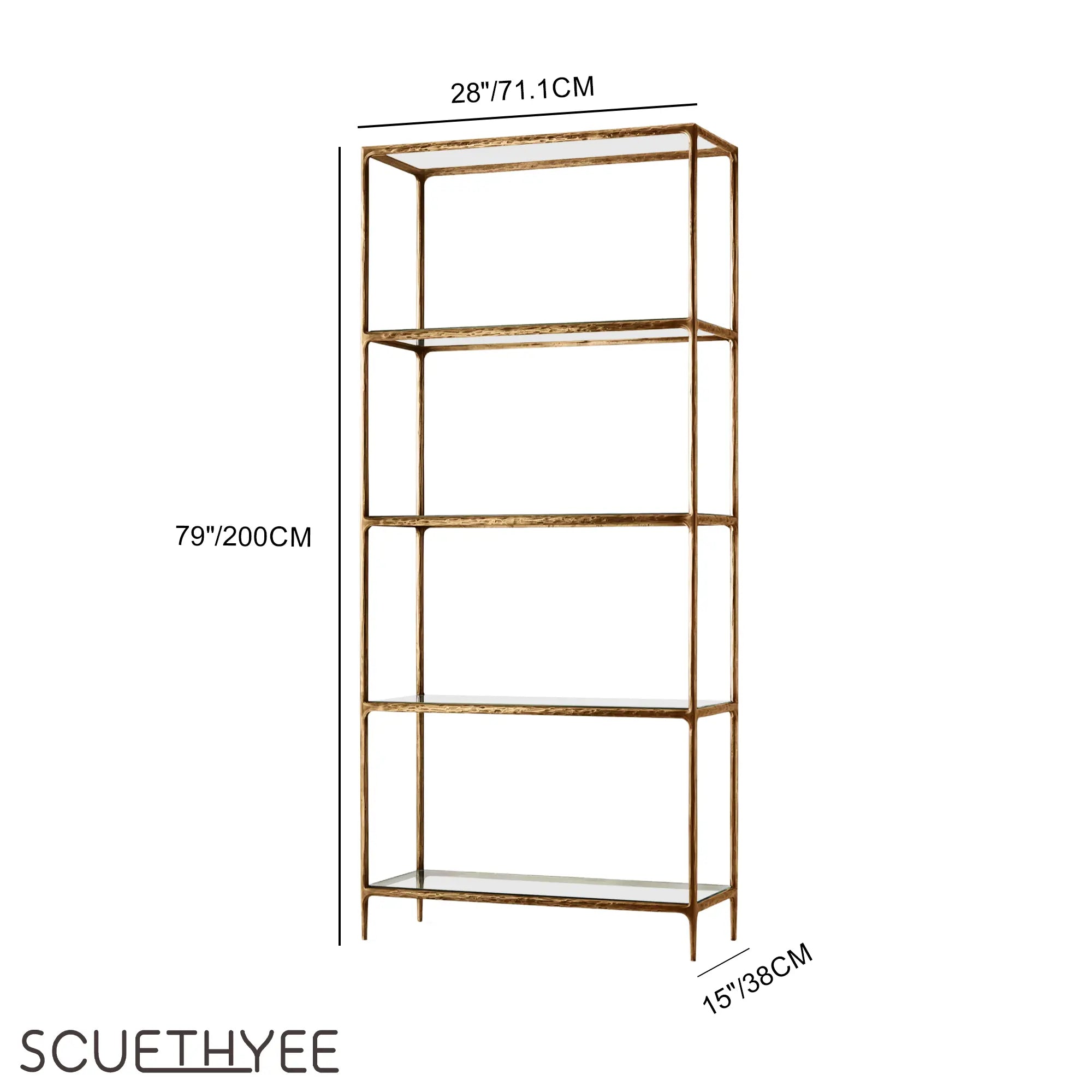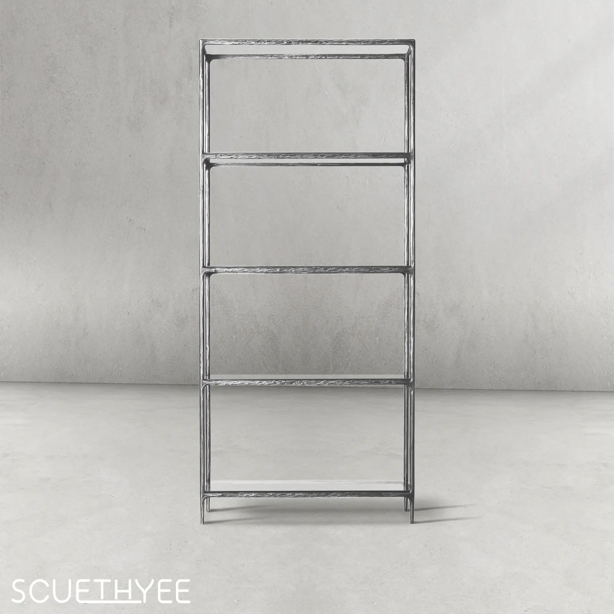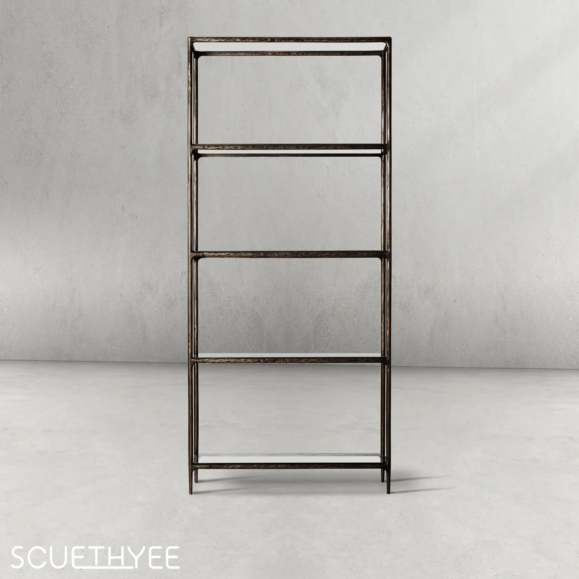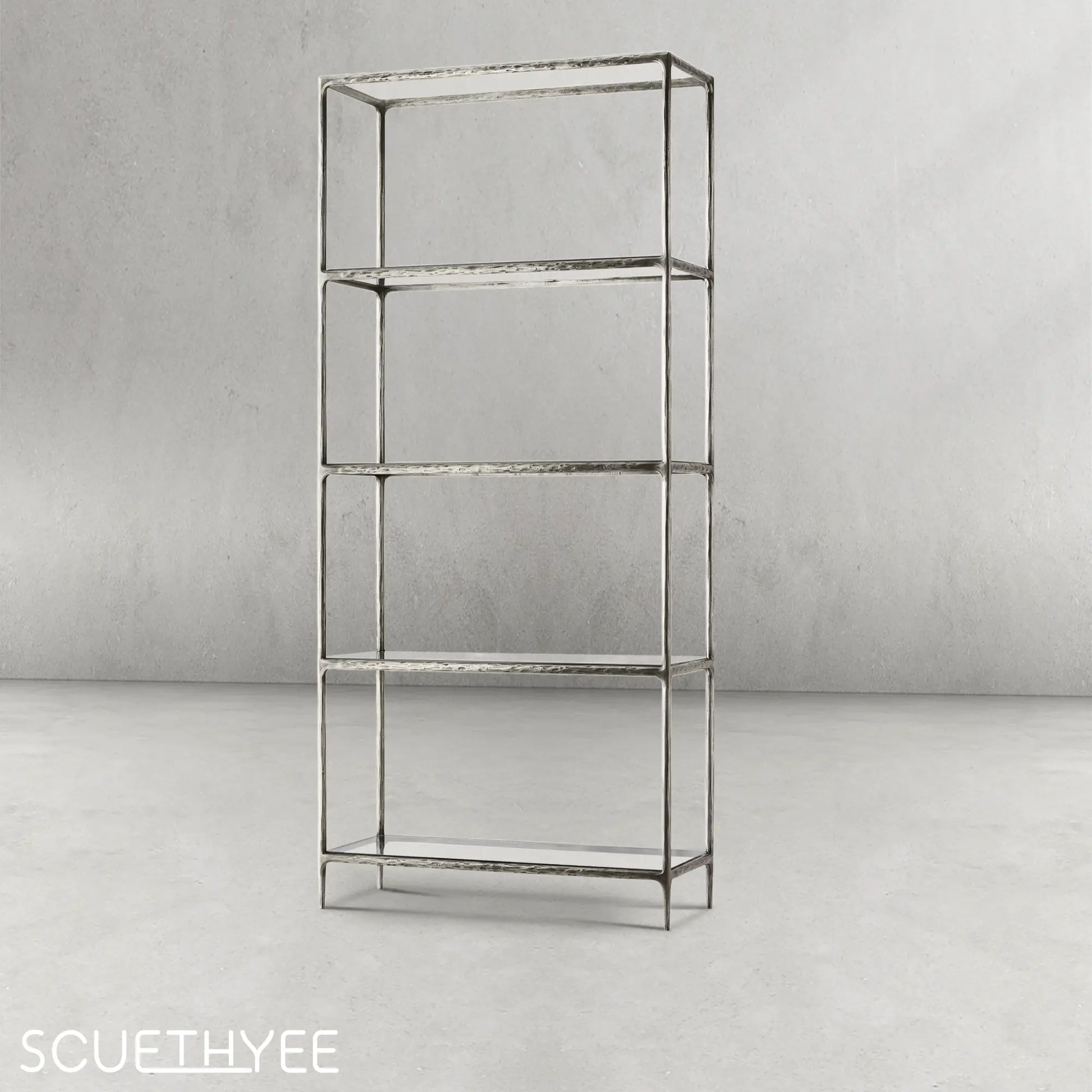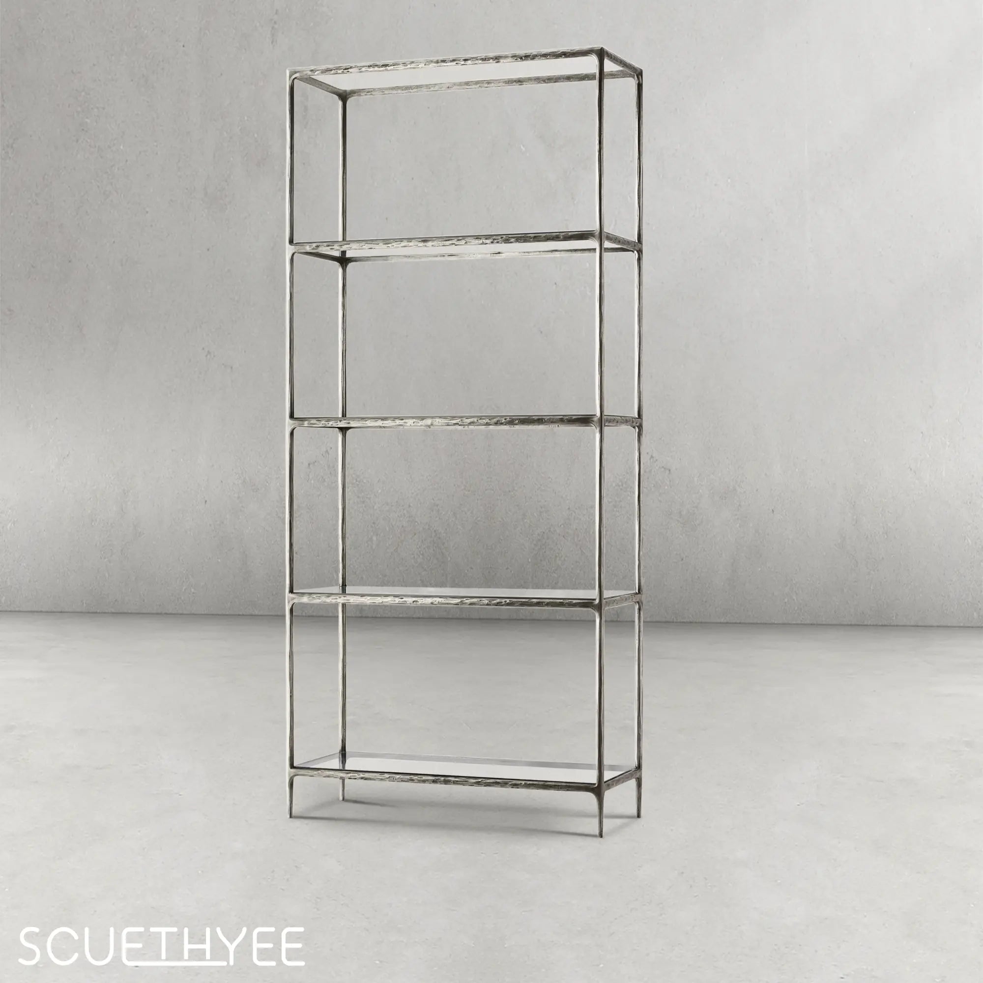 Our Thaddeus collection combines a hand-forged metal base with the rustic feel of glass shelving. Using an ancient crafting technique, artisans hand-hammer metal strips for a vibrant, imperfectly organic texture that complements the frame's slim, tapered silhouette.