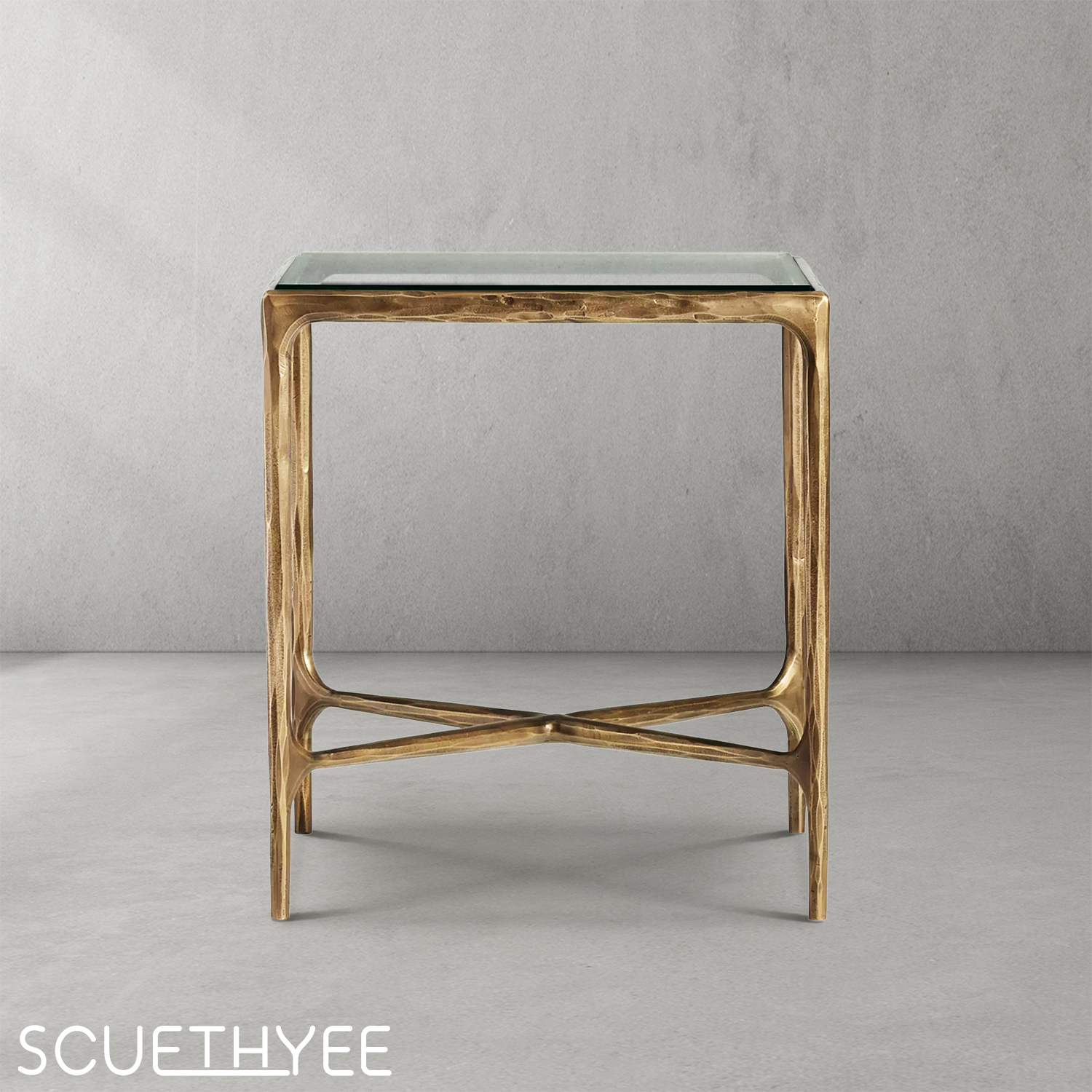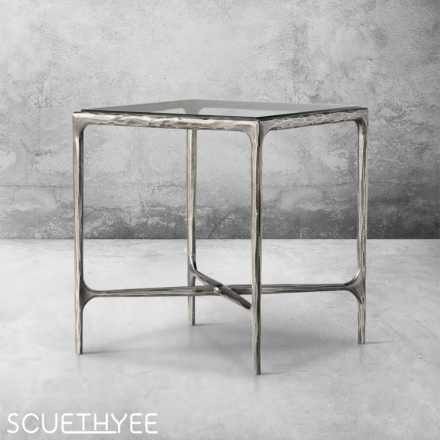 Inspired by the sculptural works of Salvador Dalí and Diego Giacometti, our collection by Alexander merges the rustic sensibility of a hand-forged metal base with a clear glass top. Employing an ancient fabrication process, artisans hand hammer the metal bars to reveal an alive, imperfect and organic texture, a counterpoint to the frame's slender, tapered silhouette.