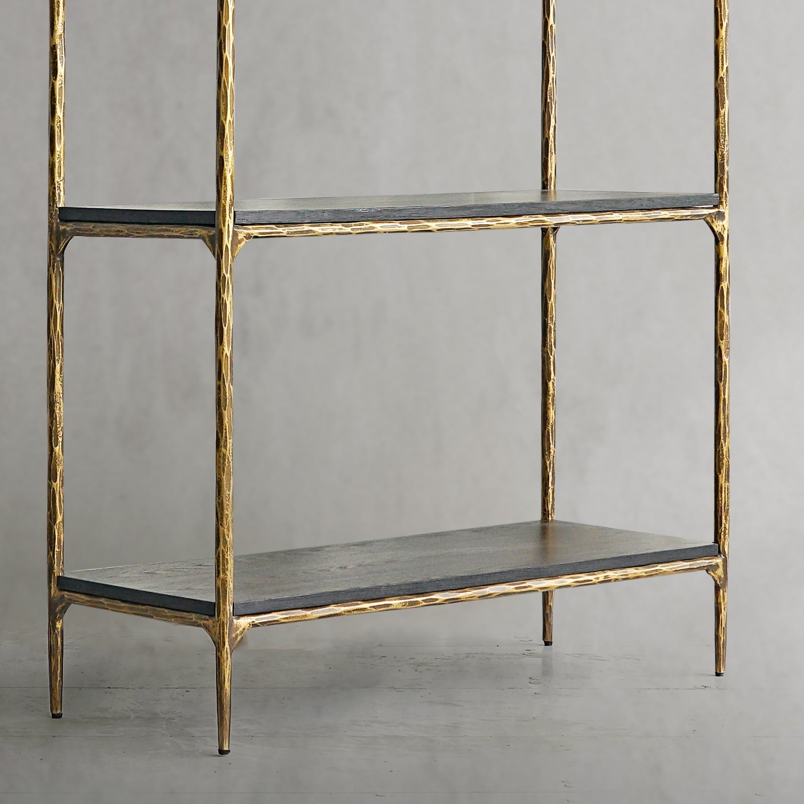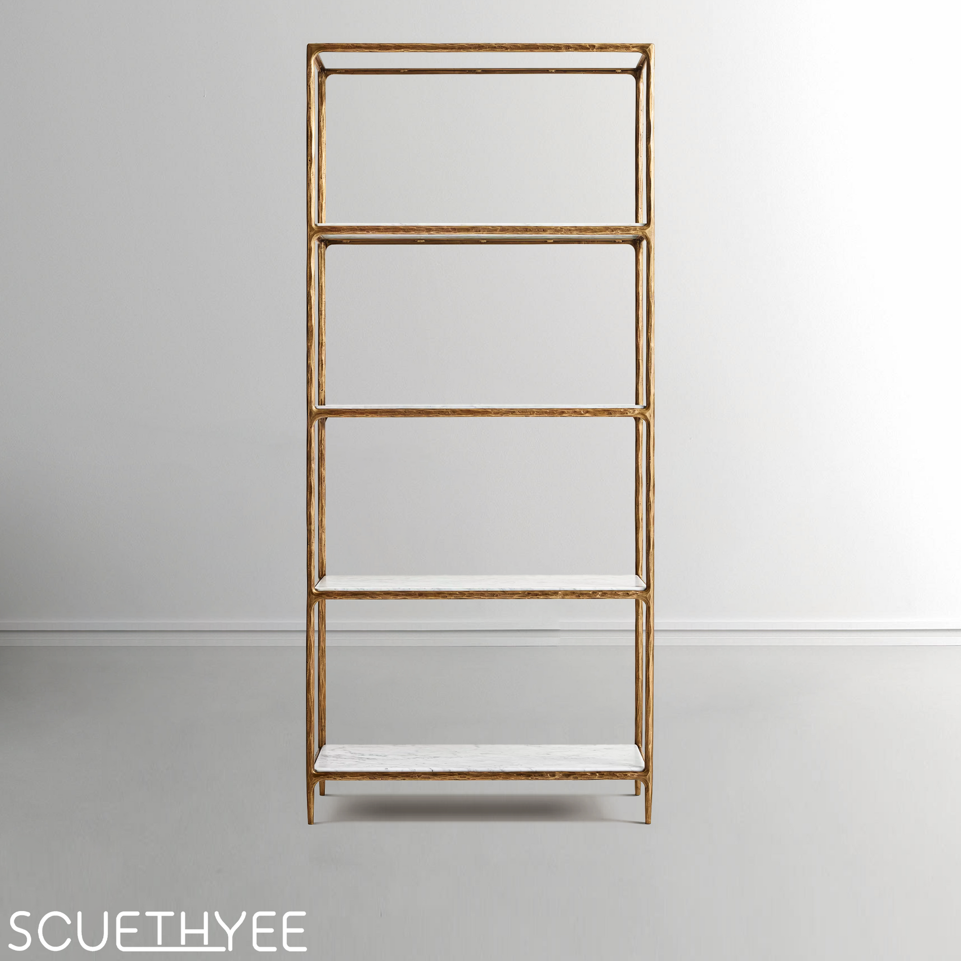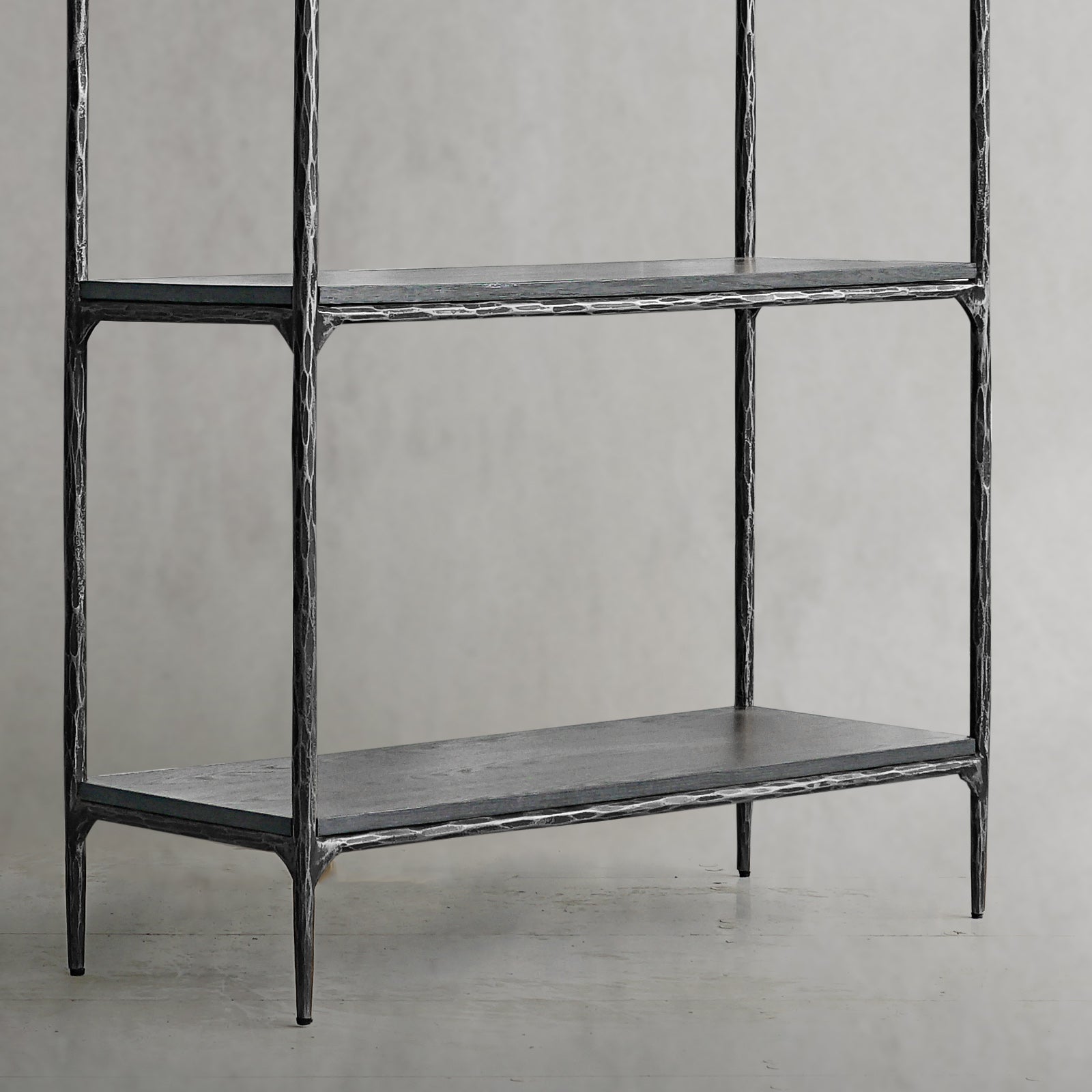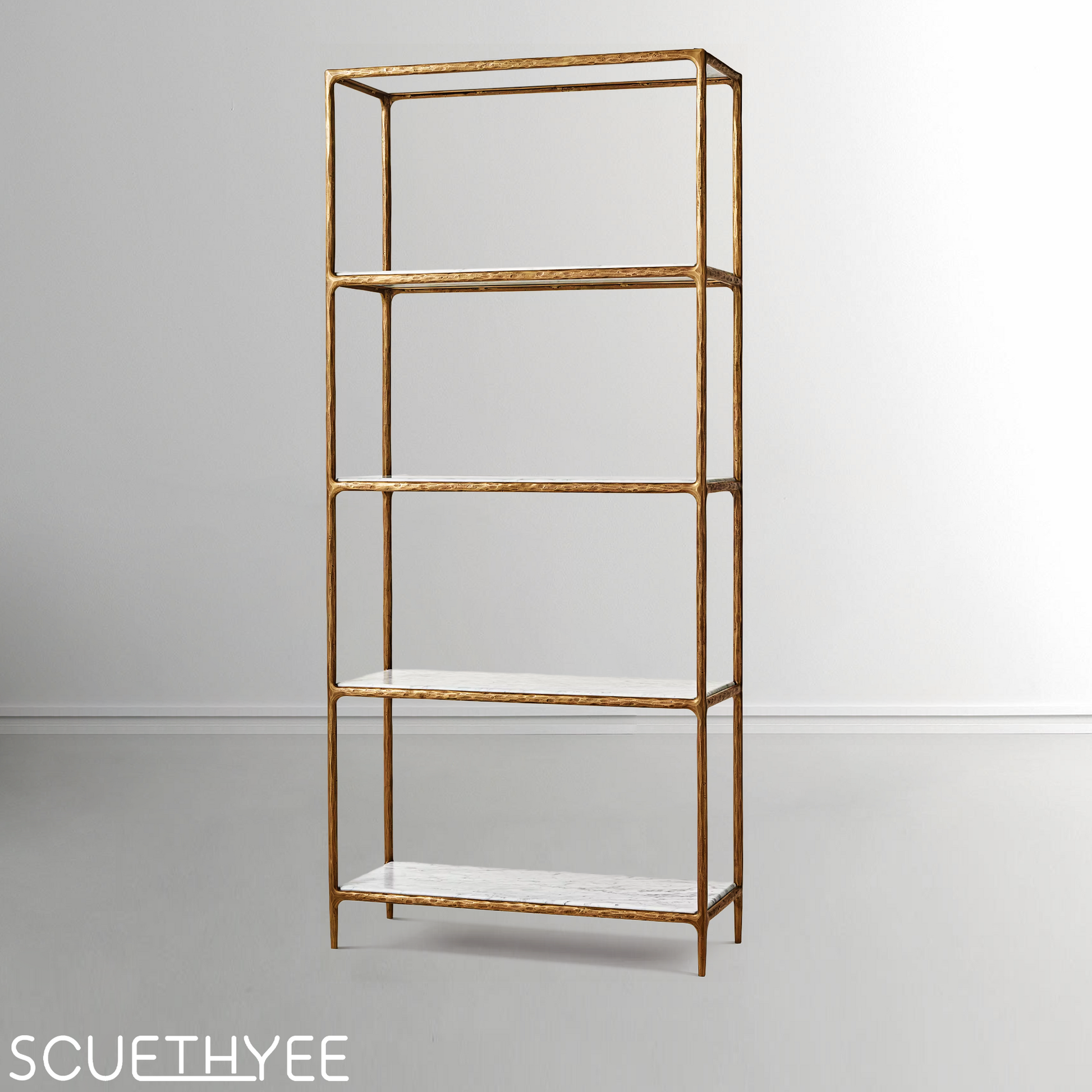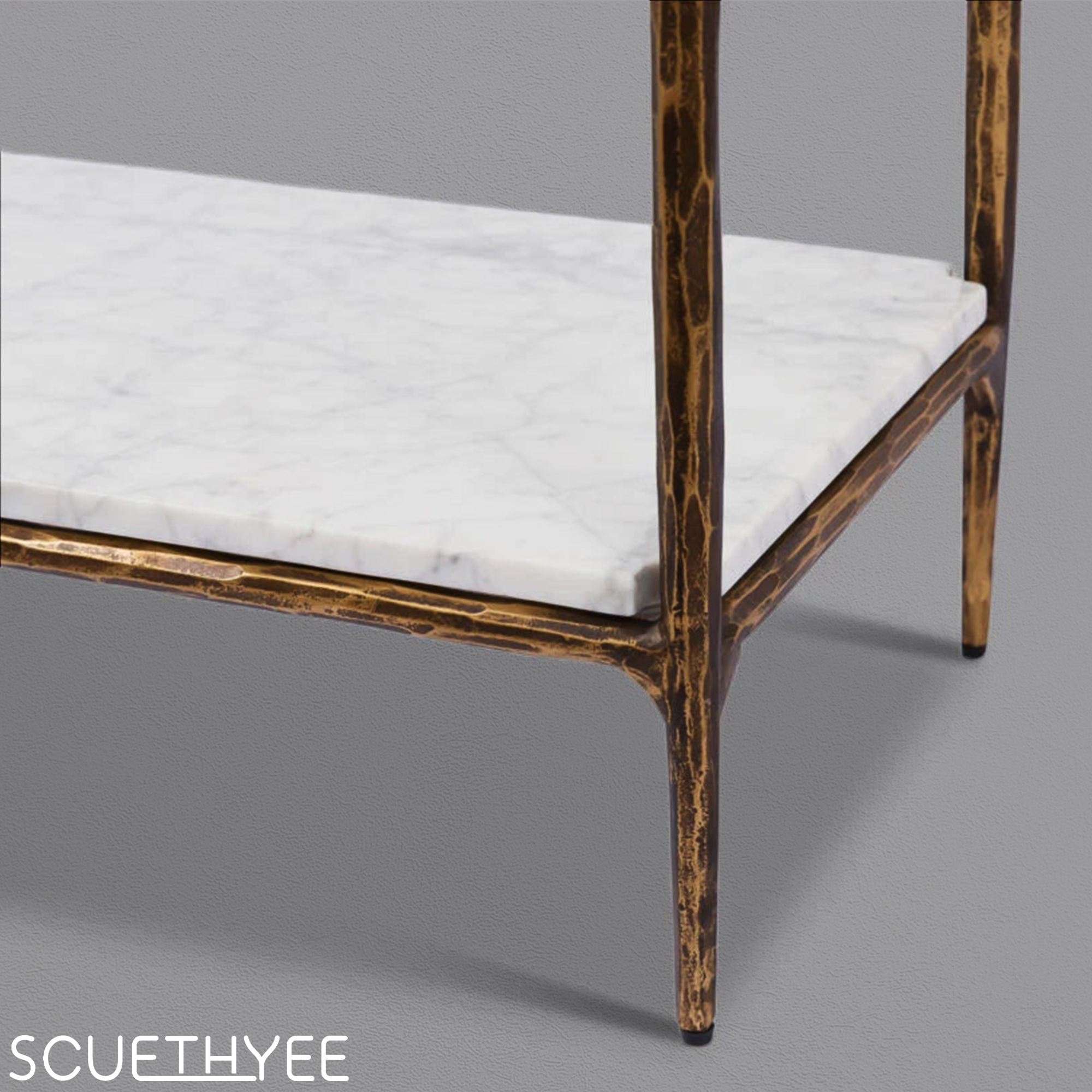 Our Thaddeus collection combines a hand-forged metal base with the rustic feel of marble shelving. Using an ancient crafting technique, artisans hand-hammer metal strips for a vibrant, imperfectly organic texture that complements the frame's slim, tapered silhouette.