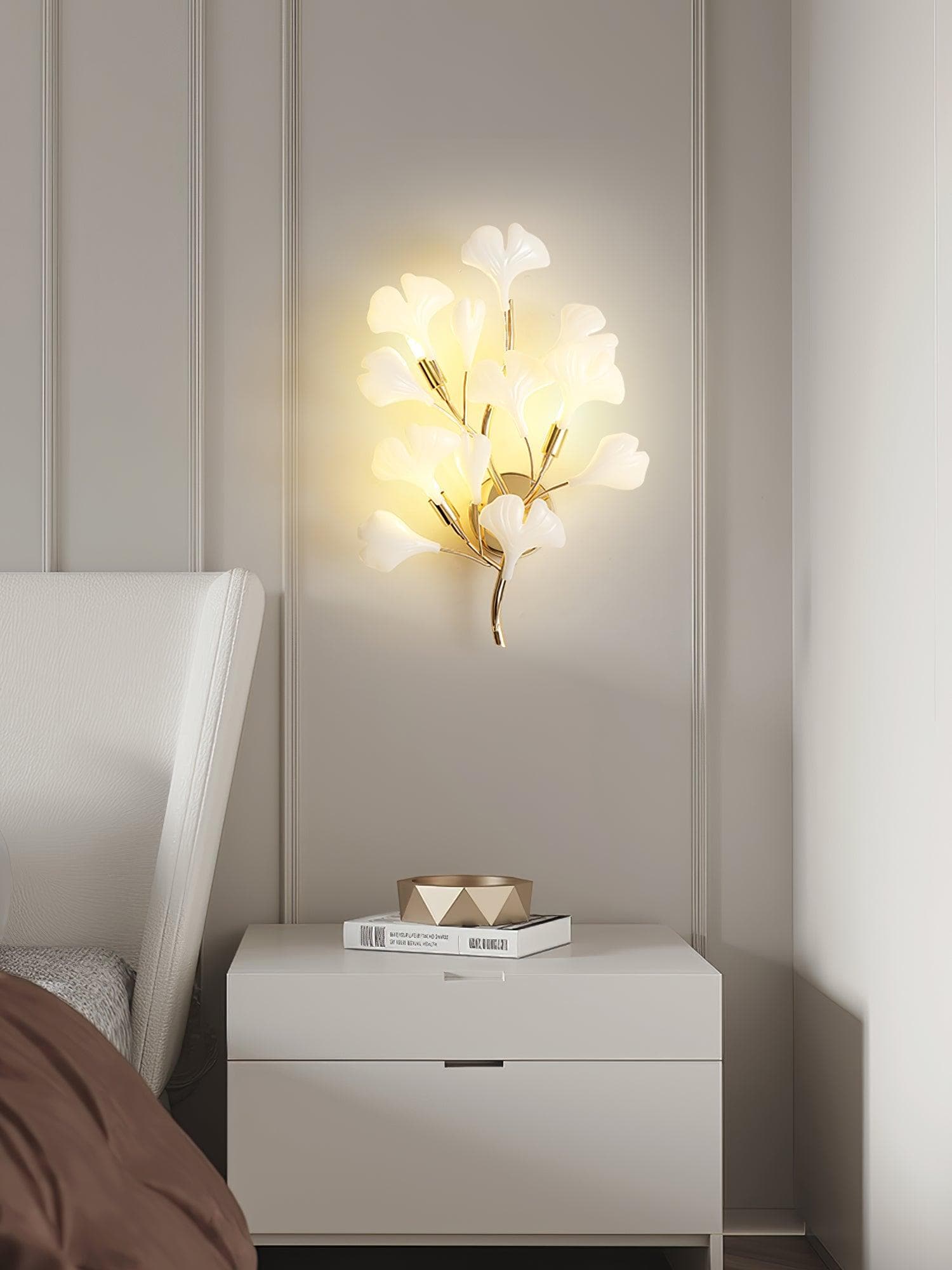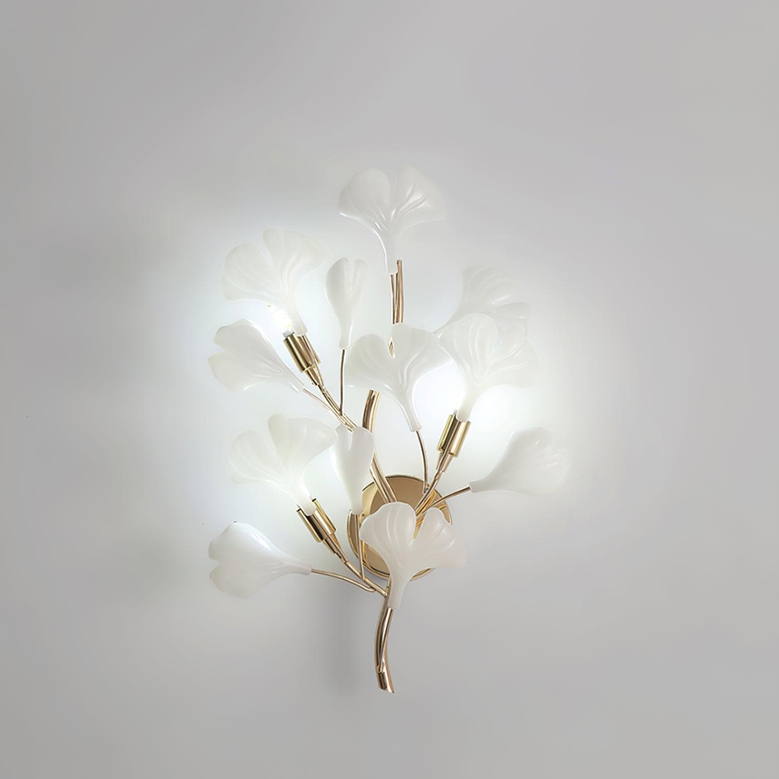 This particular ginkgo leaf-shaped wall lamp is an absolute eye-catcher in your interior! The wall lamp is made of a shiny gold+white finish that radiates warmth and elegance. Mid Century Sconce is strikingly distributed throughout the wall. Even when turned off, this sculptural lamp is a gorgeous piece of jewelry on the wall. It's a striking alternative to a painting, tapestry, or mirror.