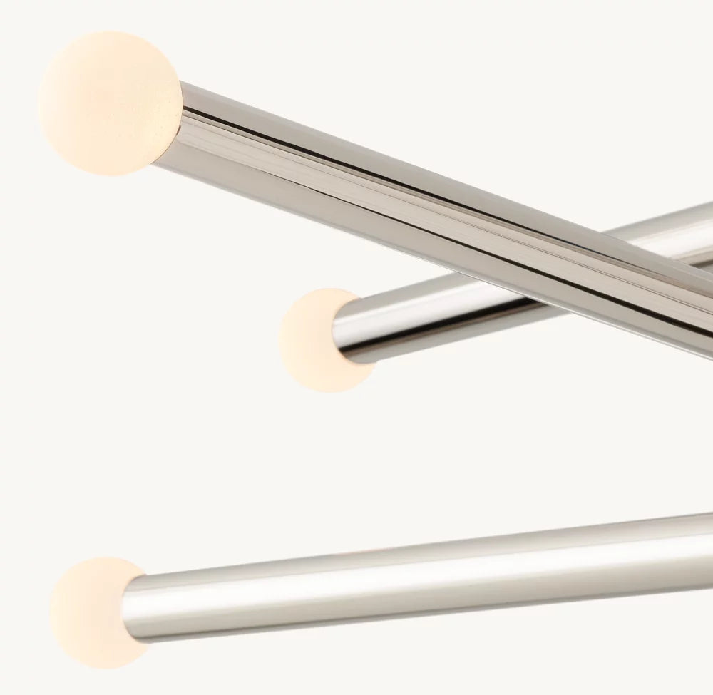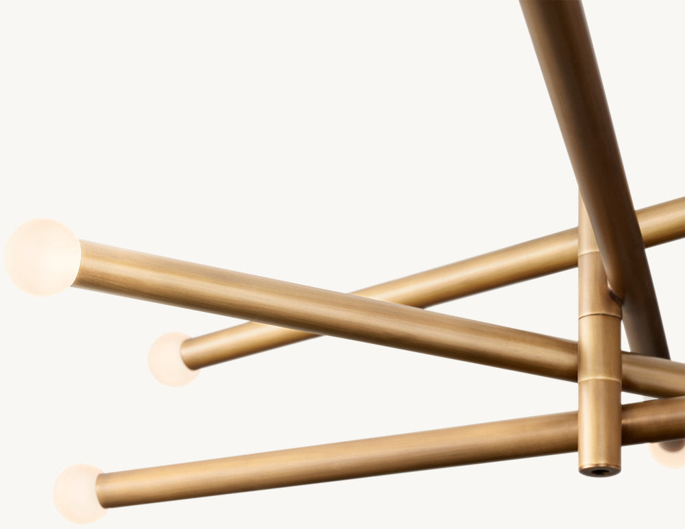 Inspired by minimalist midcentury Italian design, our contemporary interpretation of the chandelier offers reductionist form in a striking silhouette. Each end of Rousseau's slender arms bears an etched glass orb fitted with an integrated LED bulb. When lit, the fixture emits a warm, filtered glow.