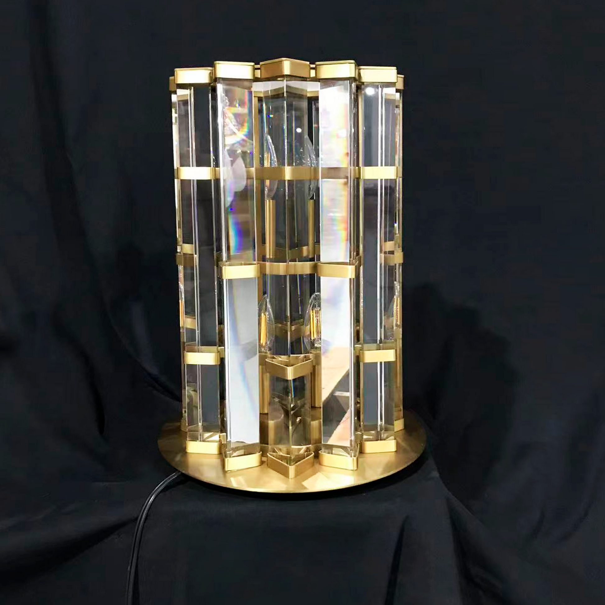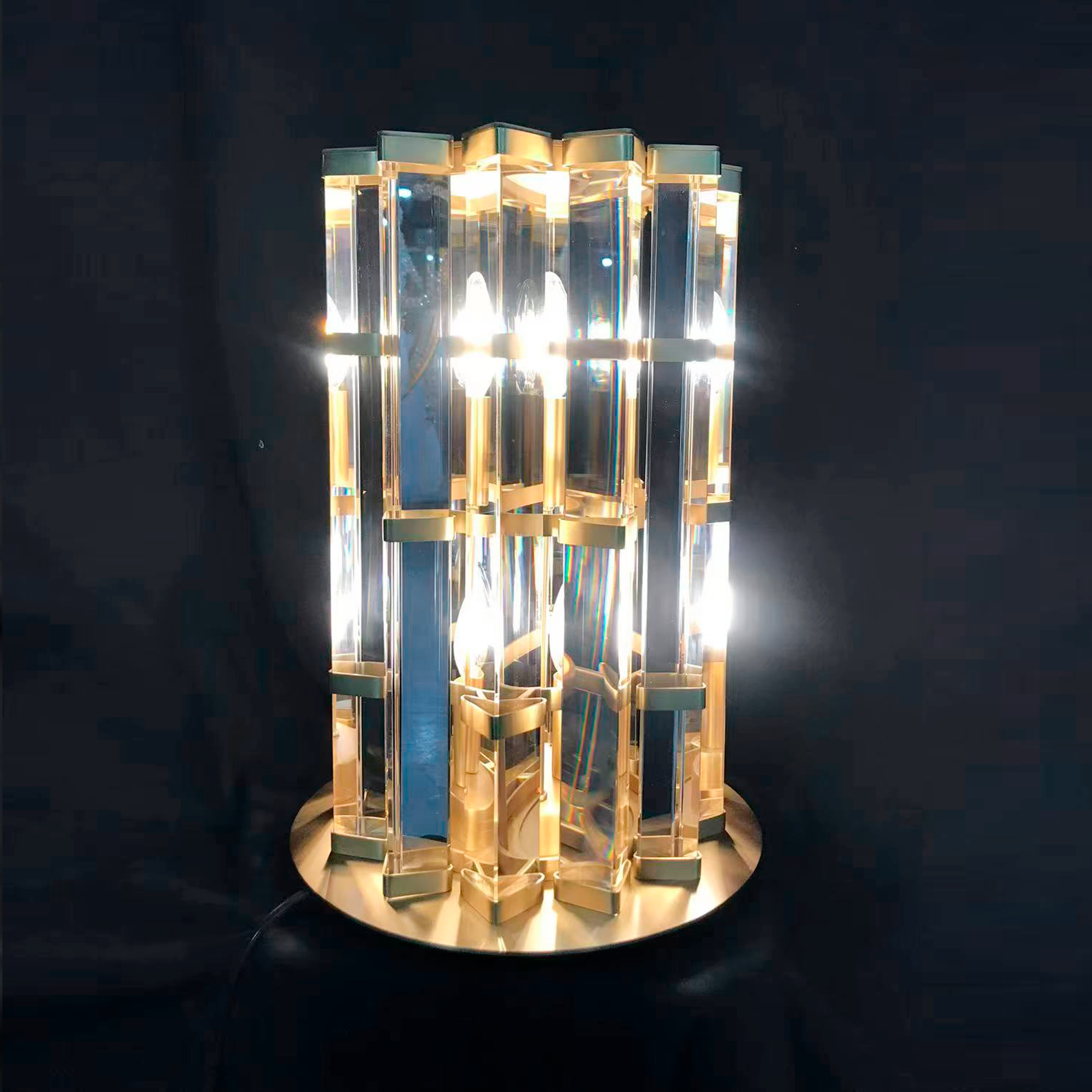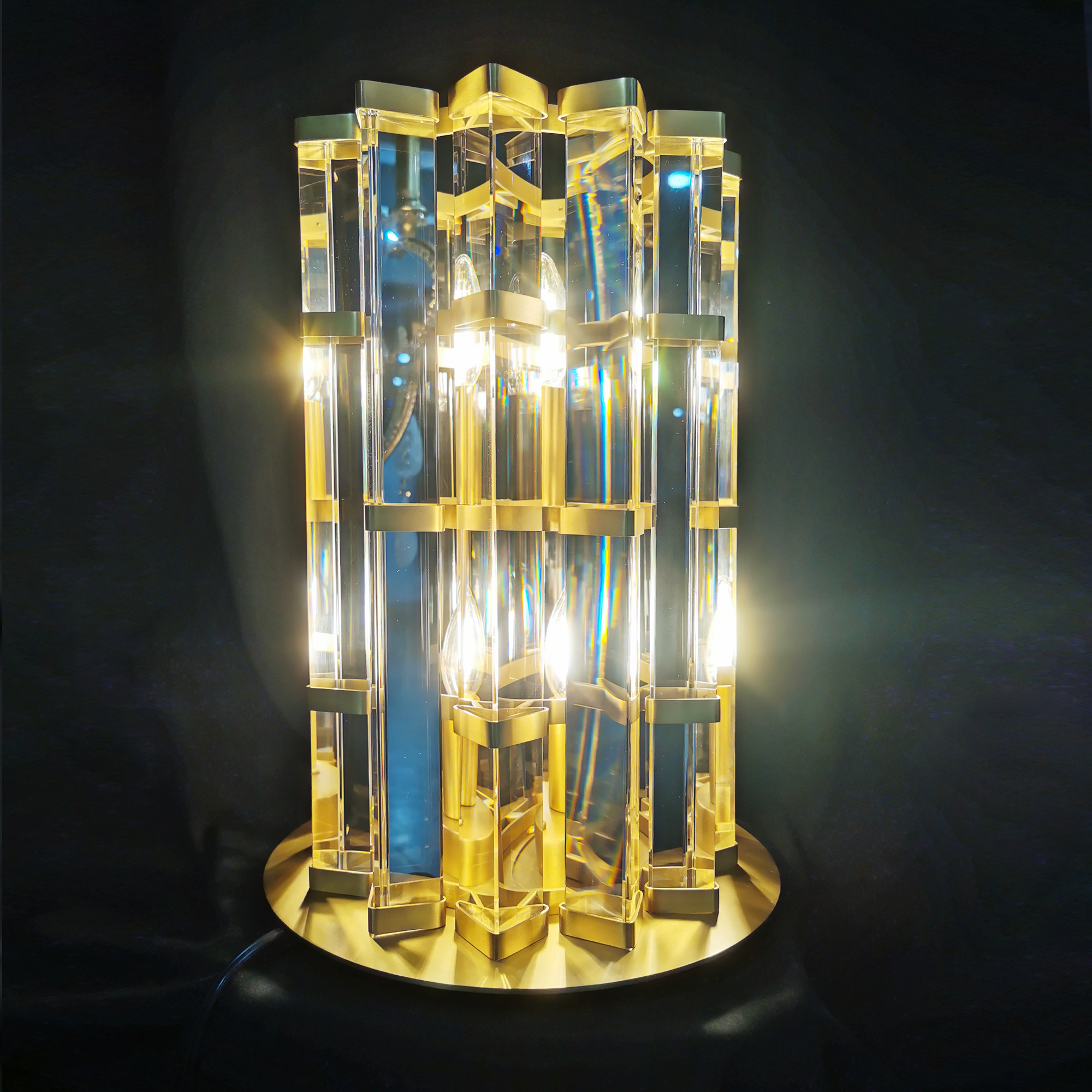 The mesmerizing Luminous Stick Table Lamp is inspired by the unobtrusive glow of the night. Long optical-grade glass prisms are closely spaced to create a staggered effect on a copper-plated or natural metal skeleton. The triangular prisms reflect and refract light from all directions, creating a shimmering, dancing effect.