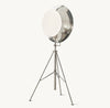 Referencing the drama of vintage theater stage lights, our fixture by designer Thomas O'Brien is a modernist interpretation. A pair of concentric discs – one in gleaming, hand-rubbed brass, the other in translucent white linen – rest upon a tripod base, reflecting and diffusing the light to stunning effect.