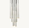 Inspired by French minimalist lighting of the 1960s, Jonathan Browning's elegant design features a cluster of solid brass forms suspended from slender black cords. Inset LEDs at the faceted glass tips offer warm, glowing light.