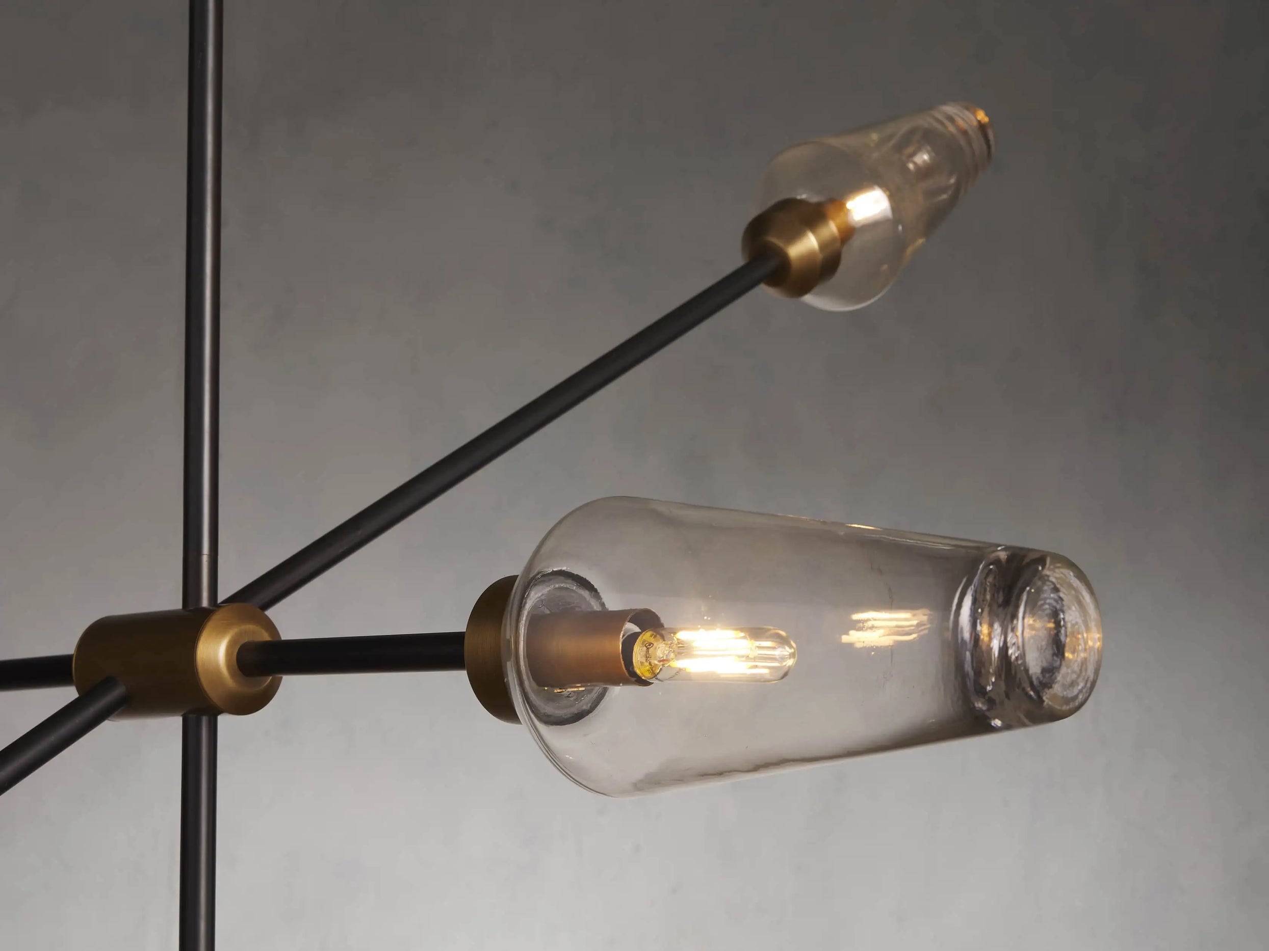 With dense, mouth-blown glass living harmoniously with bronze accents, the striking silhouette of our Arrow Bronze Chandelier creates a perfectly asymmetrical yet linear design.