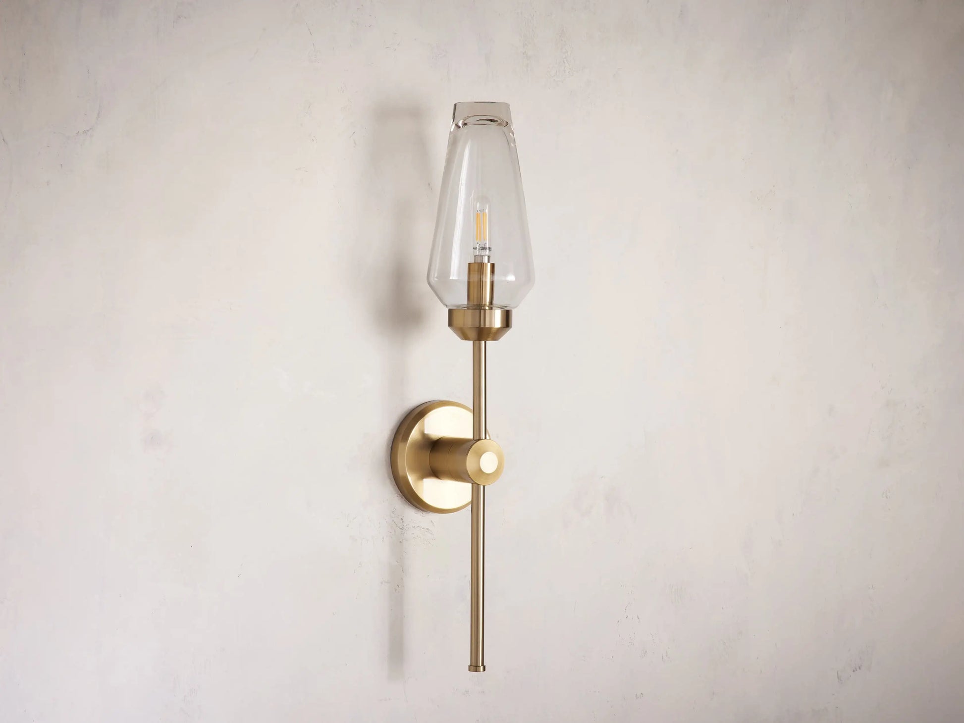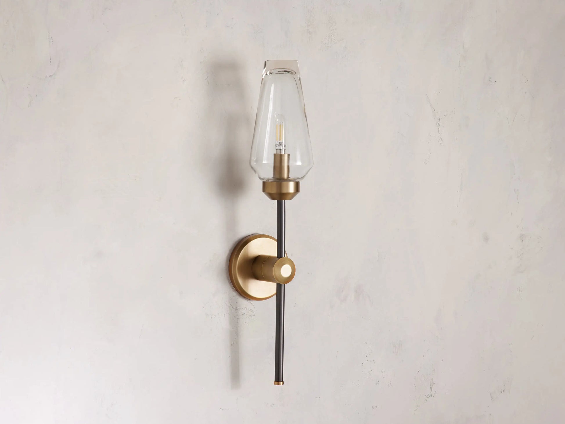 With dense, mouth-blown glass living harmoniously with bronze and brass accents, the striking silhouette of our Arrow Lighting Collection creates a perfectly asymmetrical yet linear design.
