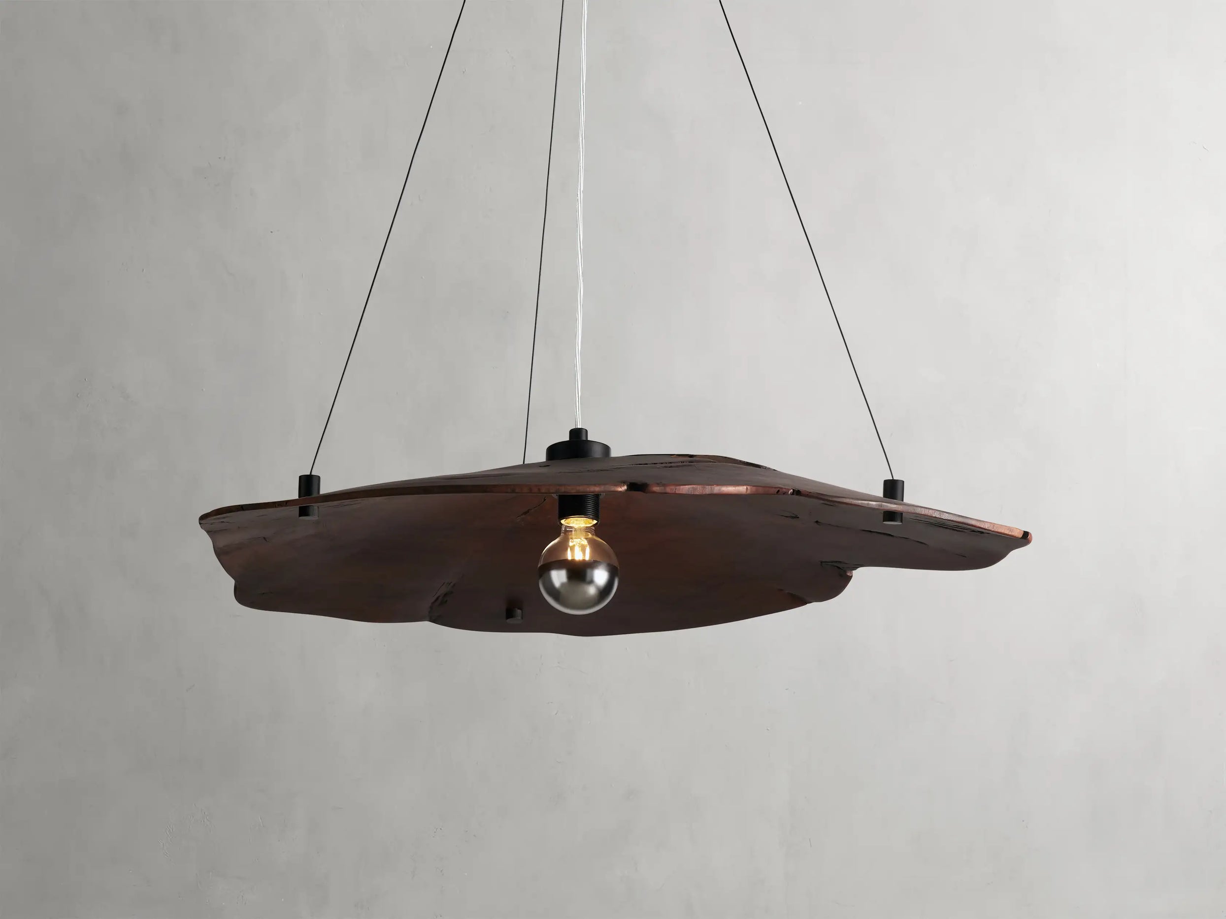 Celebrate the natural beauty of raw materials with our Arruga Collection, featuring salvaged milpa wood with every organic crack and grain pattern on display. Our imaginative artisan partners in Mexico slice the wood and leave them out in the sun to dry, creating the natural dome shape. Paired with matte black hardware and a unique metallic dipped bulb, Arruga is a showstopper for any space.
