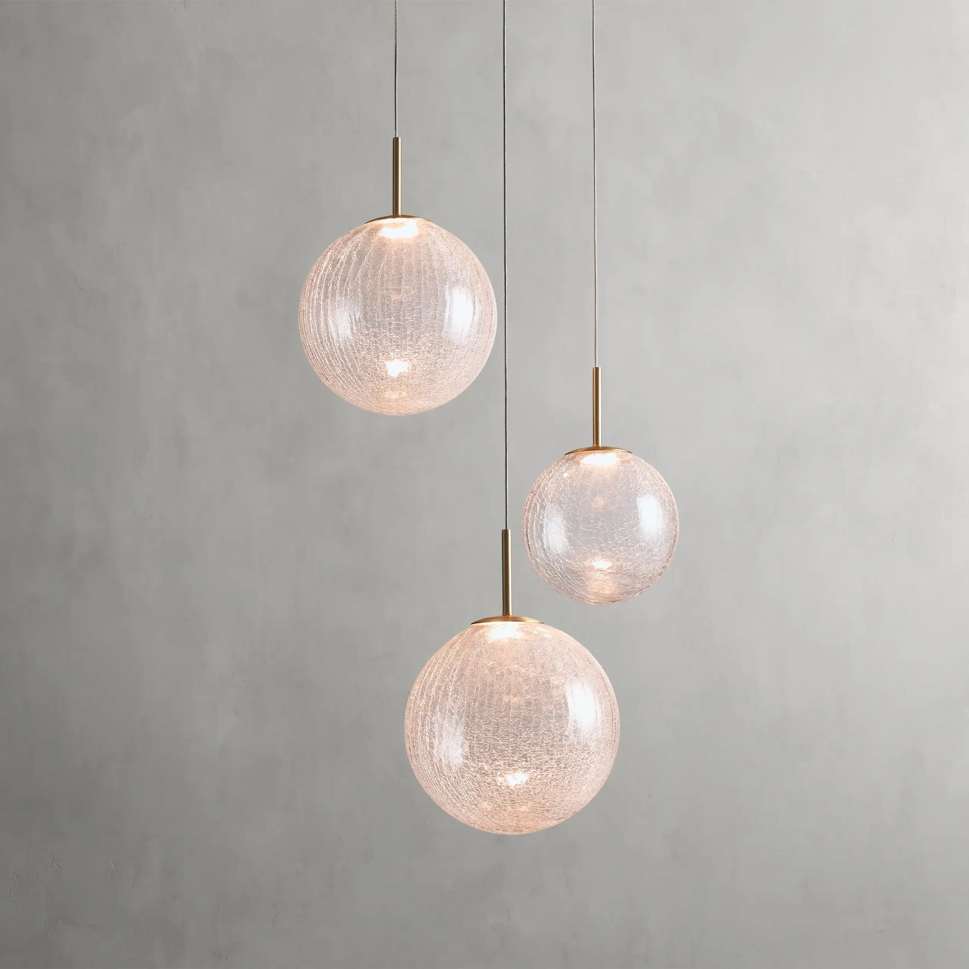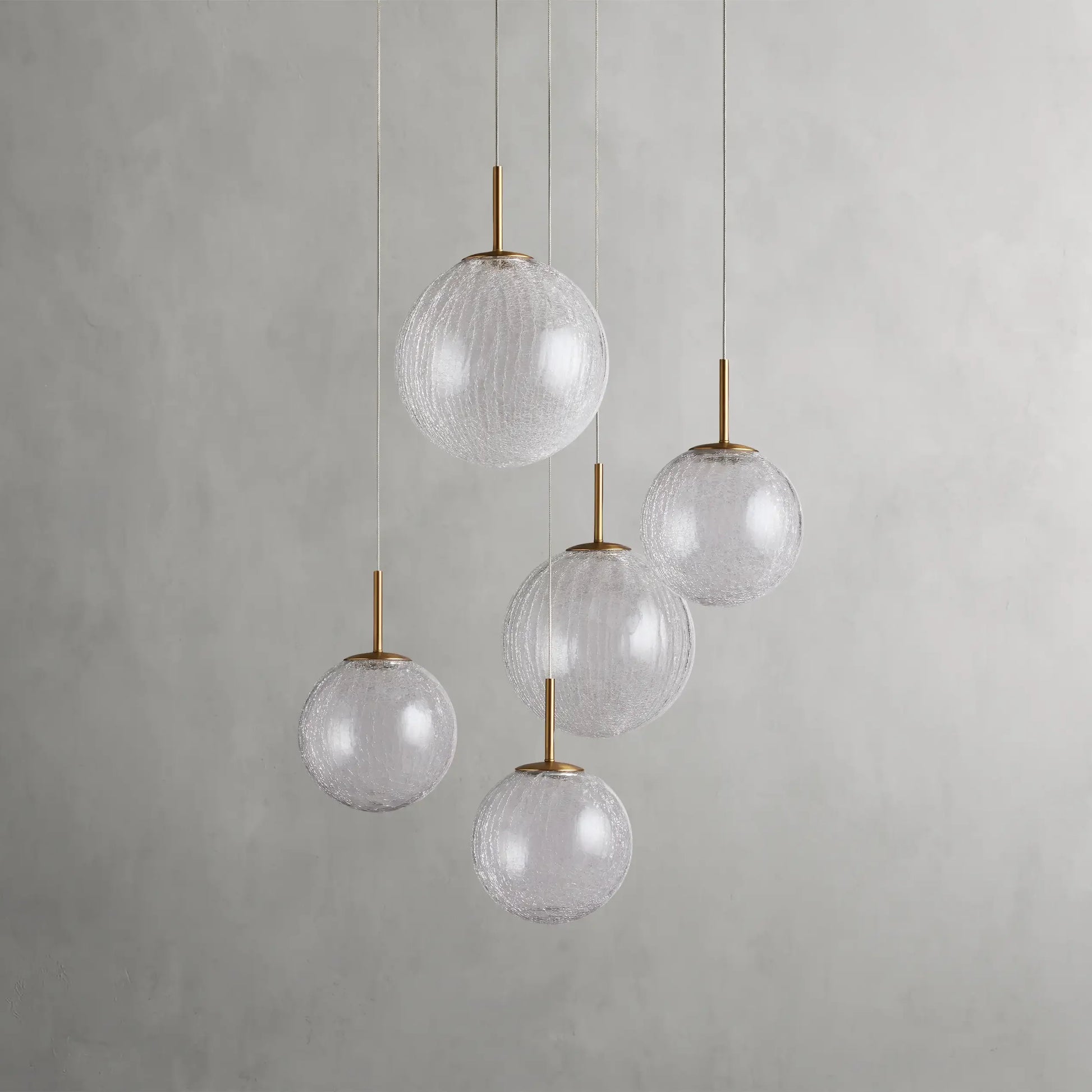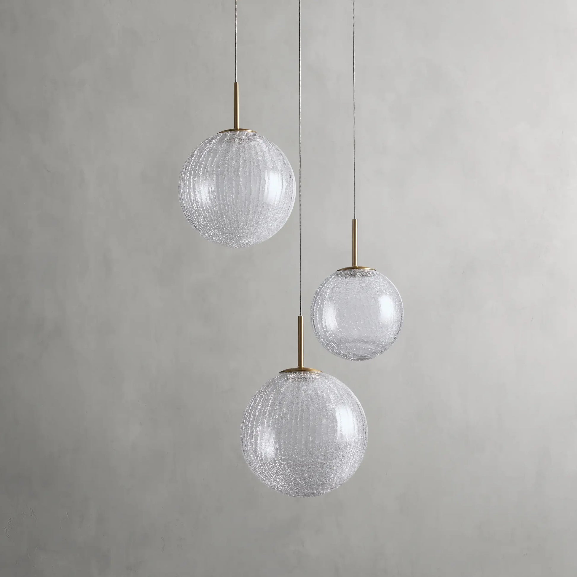 Carefully crafted glass globes hang from modern satin brass hardware from the Casen Lighting Collection. Blown by our artisan partners, each glass sphere is illuminated from within by a built-in LED light, bringing a unique, organic ambiance to your home.