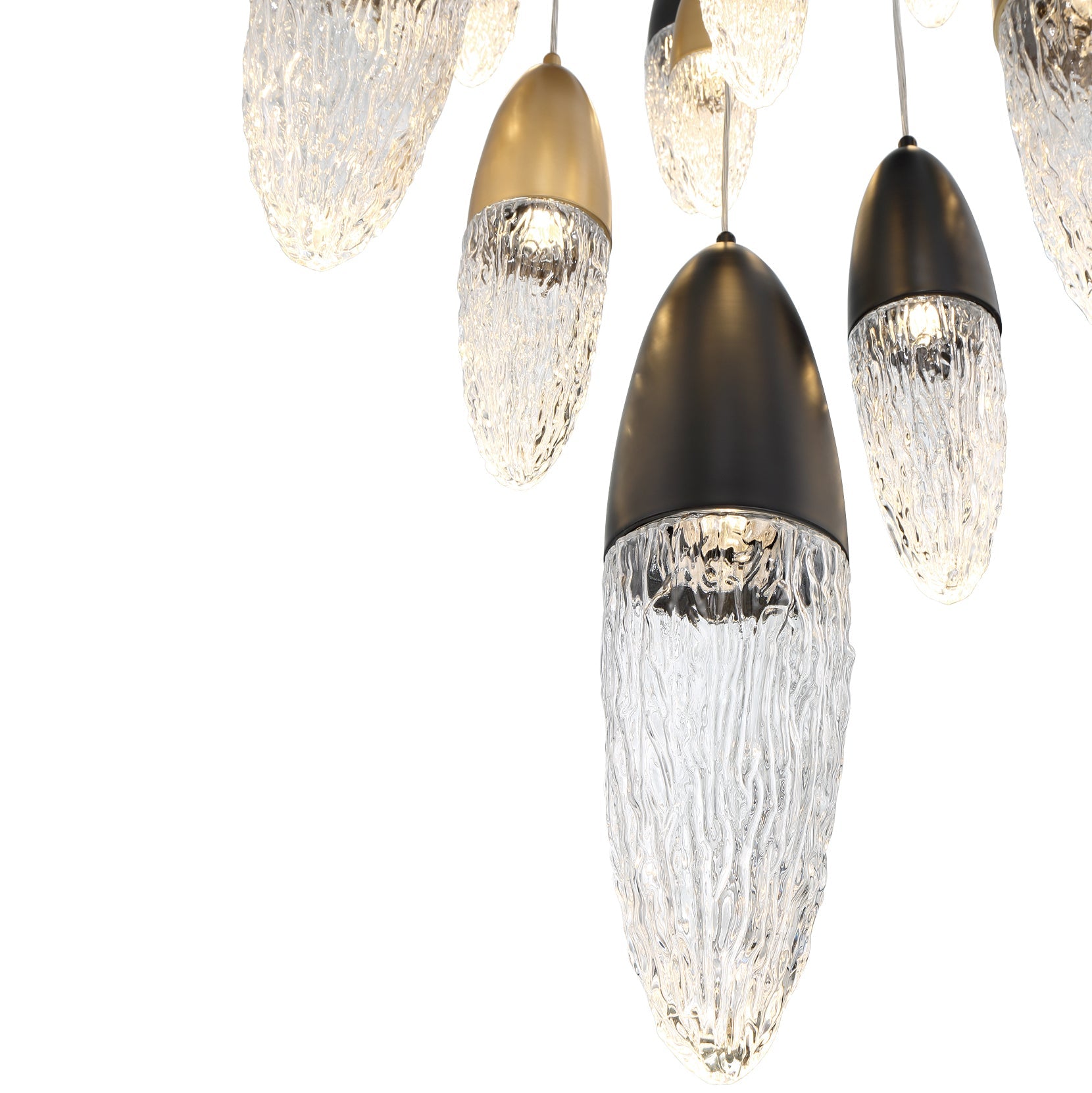 Drawing inspiration from nature, the Ecrou collection showcases large hand-blown glass shades reminiscent of large acorns. The clear glass showcases a detailed wood grain texture and is paired with your choice of matte black, matte gold, or a mix of both finishes to create a stately, stylish piece. For additional lighting options, the collection uses compatible LED fixtures