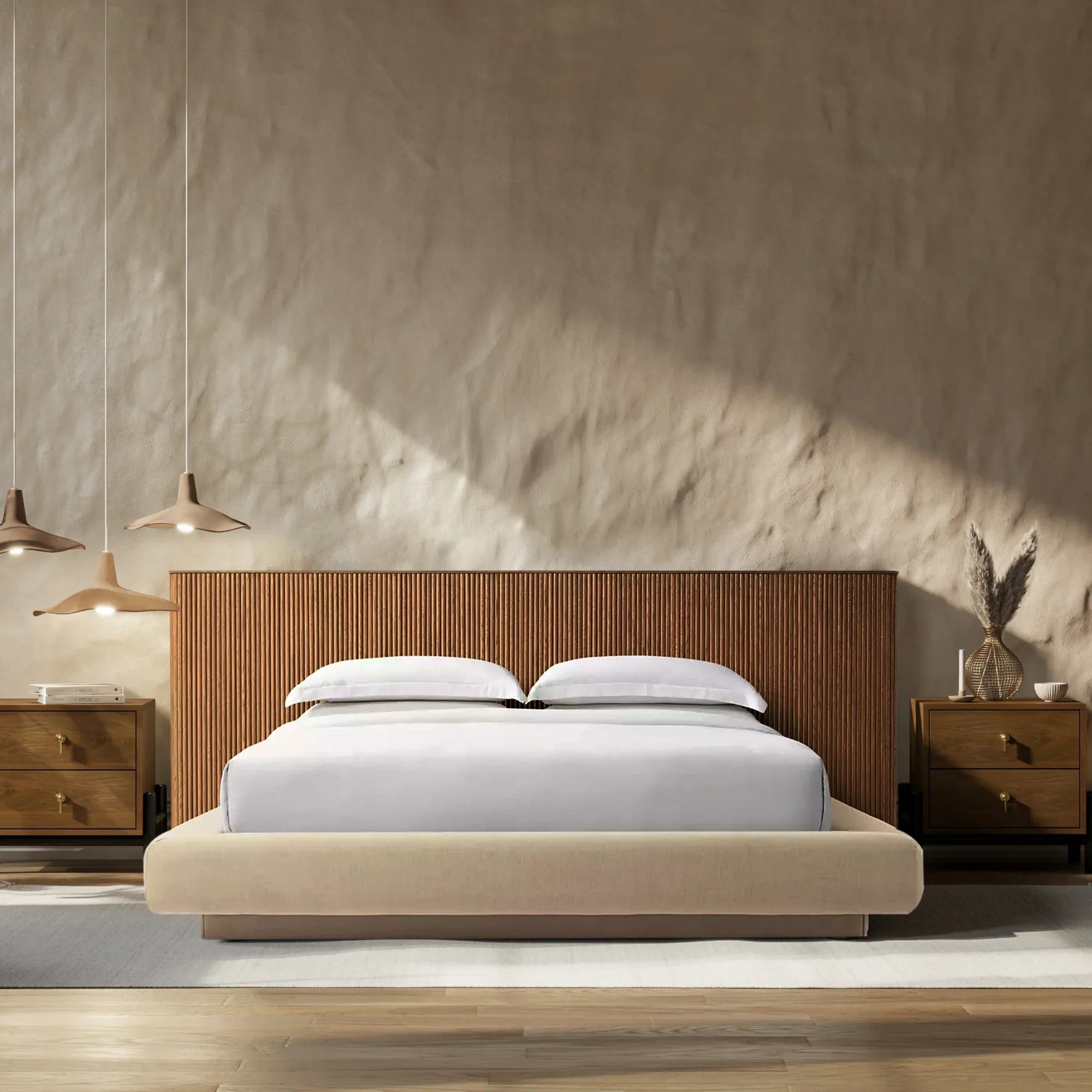 - Innovative cord cutout in the plinth base at the back of the headboard ensures tidy wire management, enhancing both functionality and aesthetics.