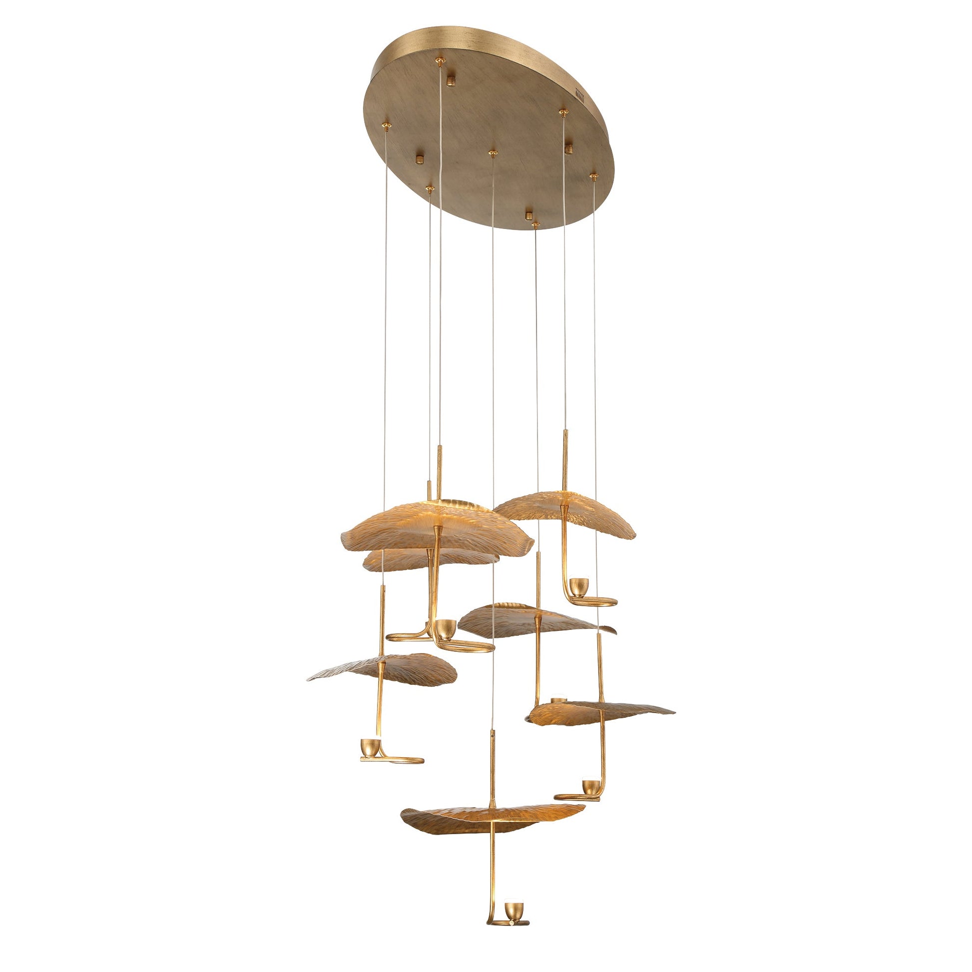 The handcrafted metal shade surface is hammered to create an organic dimpled texture. The unique curved uplight reflects to the bottom of the dome, creating a soft diffused light. This free-flowing shape is inspired by lilies, and the beauty is intensified as each lamp head cascades down.