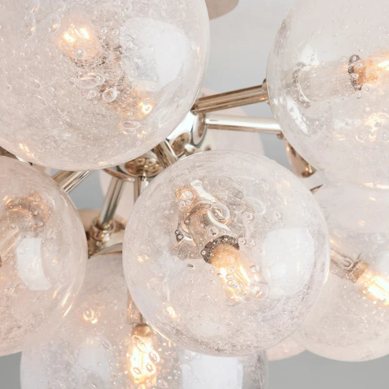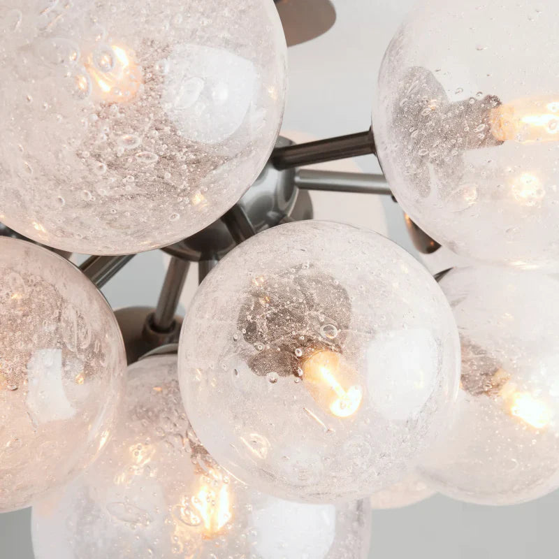 The Mandoza collection blends rustic charm and industrial design with charming silhouettes and mixed material styles. Each individual glass sphere is hand-blown using an active technique that creates a dense network of bubbles underneath a thick layer of glass. When illuminated from within, the light projected from all angles creates a stunning effect.