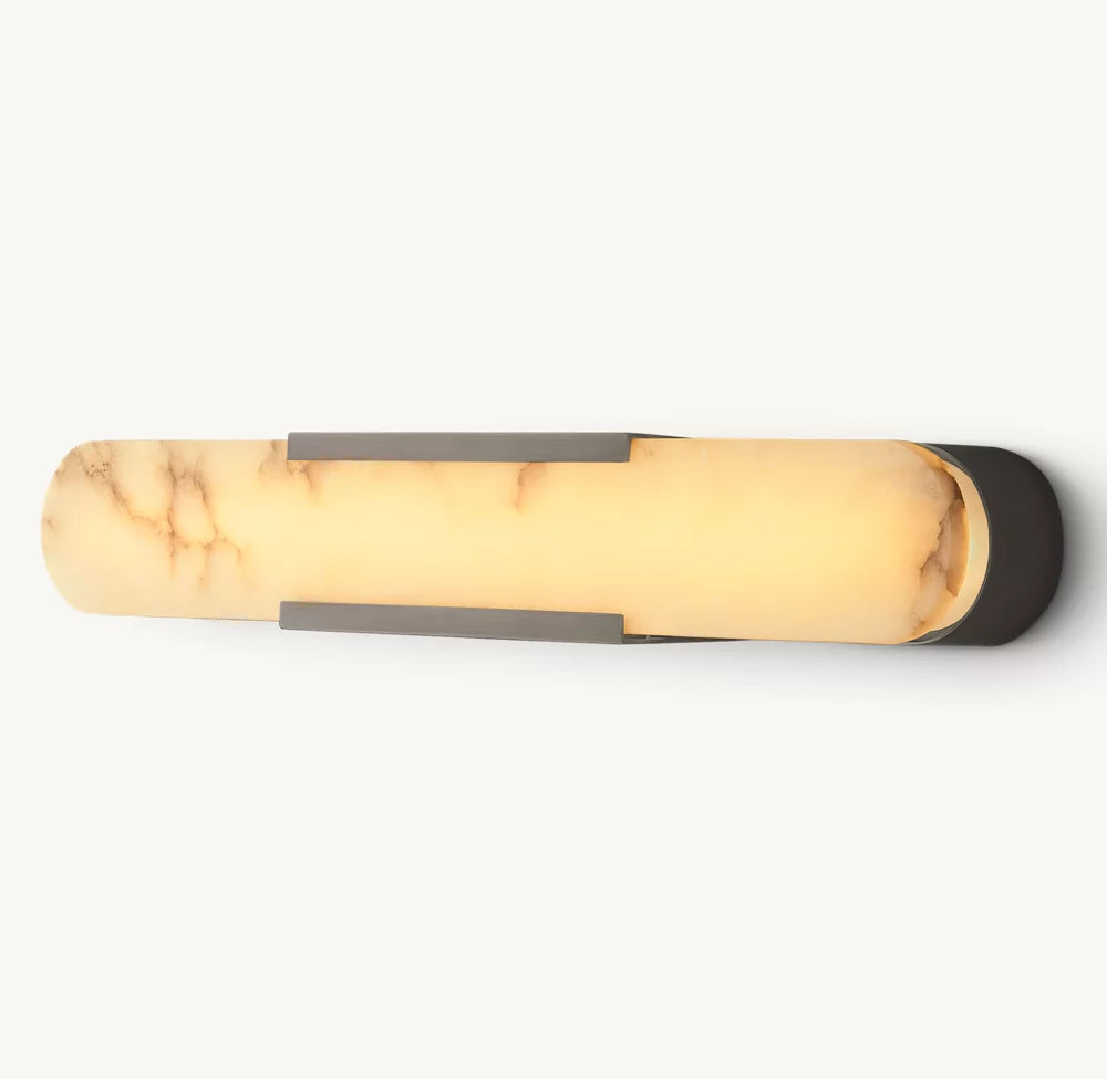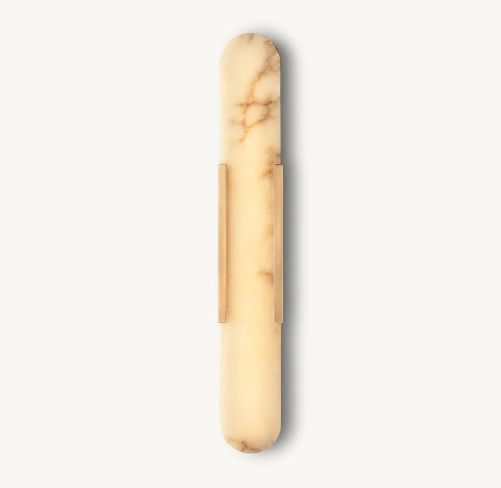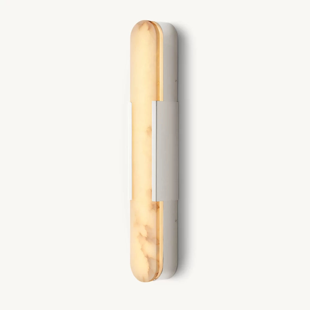 An elongated shade of richly figured alabaster lends a refined sensibility to our sconce, inspired by midcentury Italian design. Light delivers a warm glow as it passes through the translucent stone, supported by its restrained metal armature.