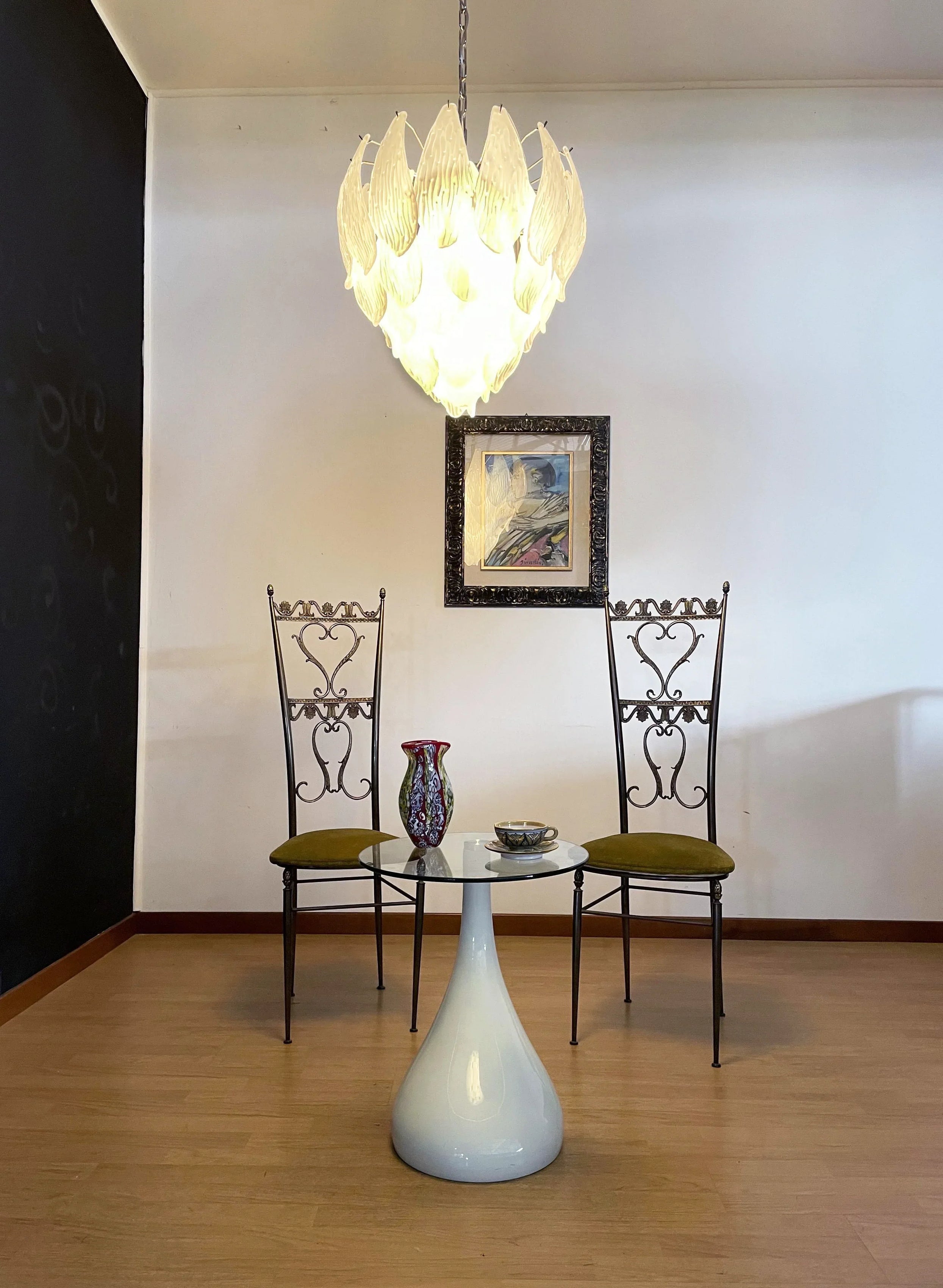 This Murano Frosted Carved Glass Leaves Chandelier, boasts a stunning combination of frosted and carved glass leaves, meticulously arranged on a sleek frame. The result is a luxurious and sophisticated piece that perfectly embodies modern elegance.