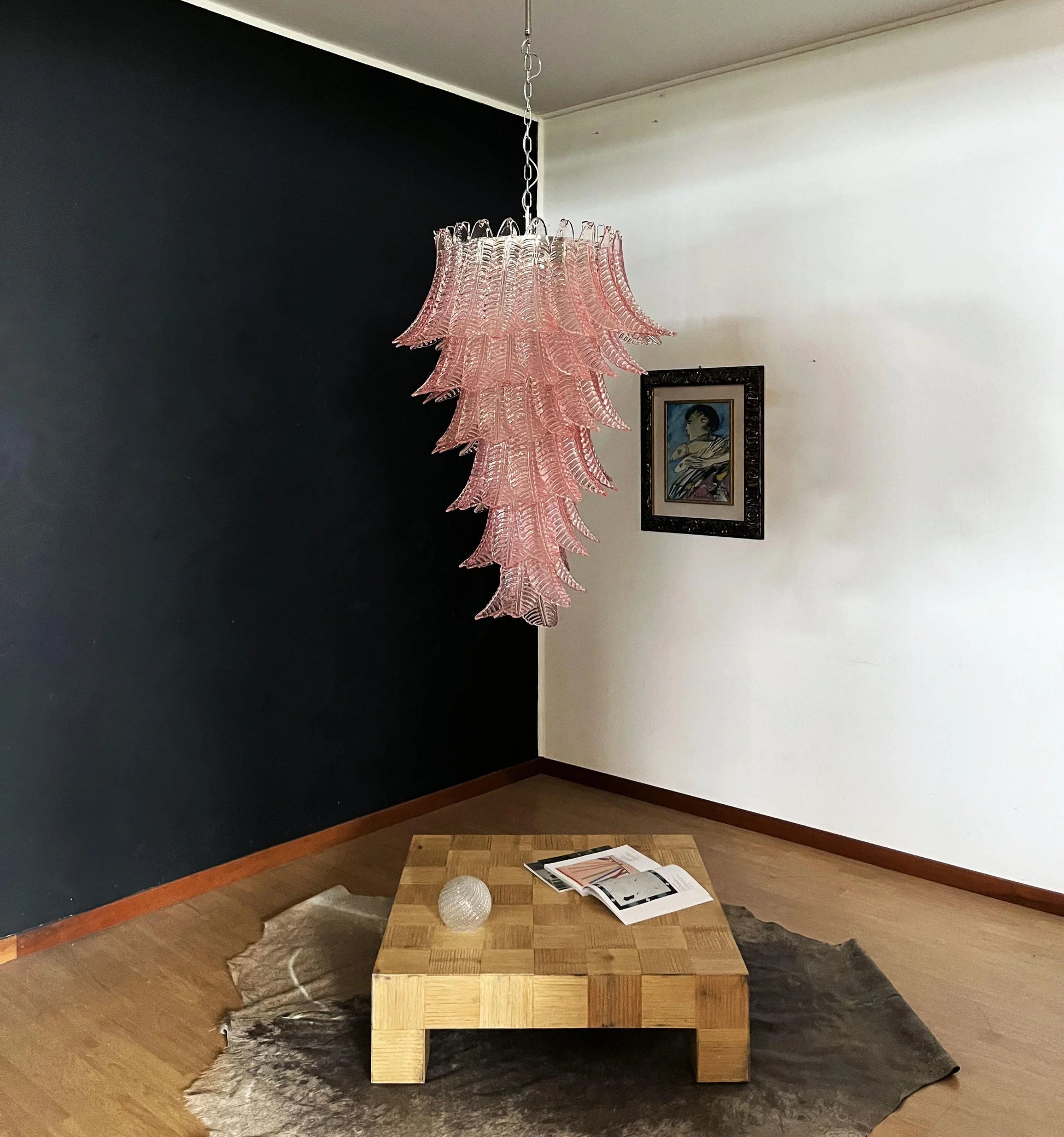 Murano Pink Felch Spiral Chandelier, Enhance your living space. This stunning piece is a perfect blend of modern elegance and artistic craftsmanship, featuring meticulously handcrafted Pink glass pieces arranged in a captivating spiral design. Illuminate your space with a captivating glow, creating a warm and inviting ambiance. Each piece of glass reflects light beautifully, adding depth and dimension to any room.