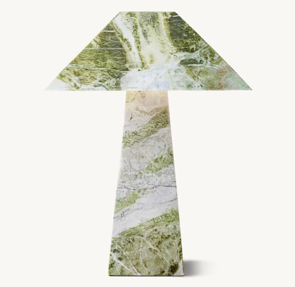 With its obelisk base and tapered shade, both handcrafted from lustrous solid stone, Mycena showcases the inherent beauty of its expressive natural materials. Rich veining and dynamic, organic tones on a minimalist silhouette bring timeless style to the modern, geometric form.
