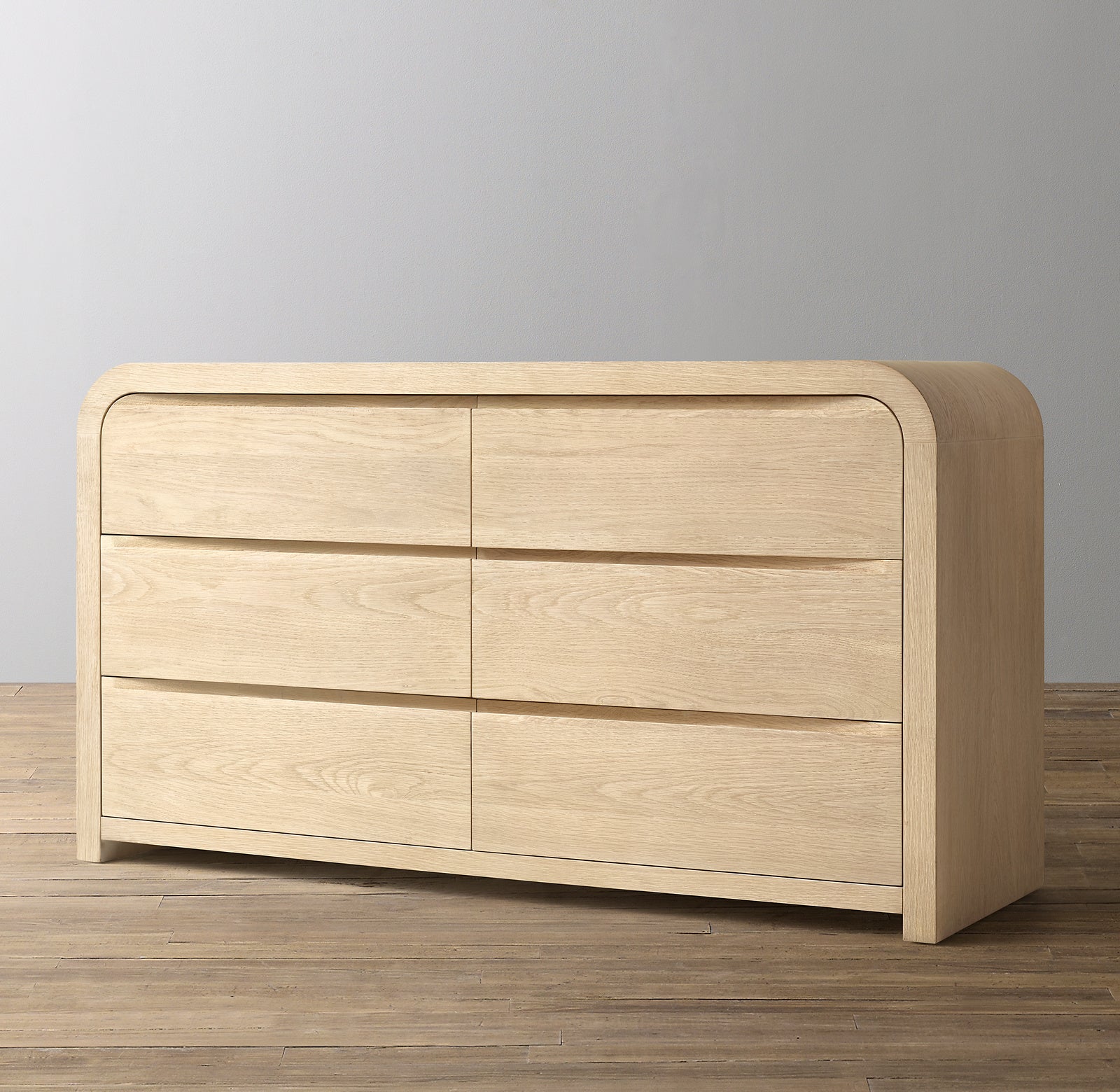 Olin's elegant waterfall silhouette is rendered in hand-brushed American oak, bringing warmth and texture to the streamlined form. The collection beautifully balances light and shadow, straight lines and organic curves.