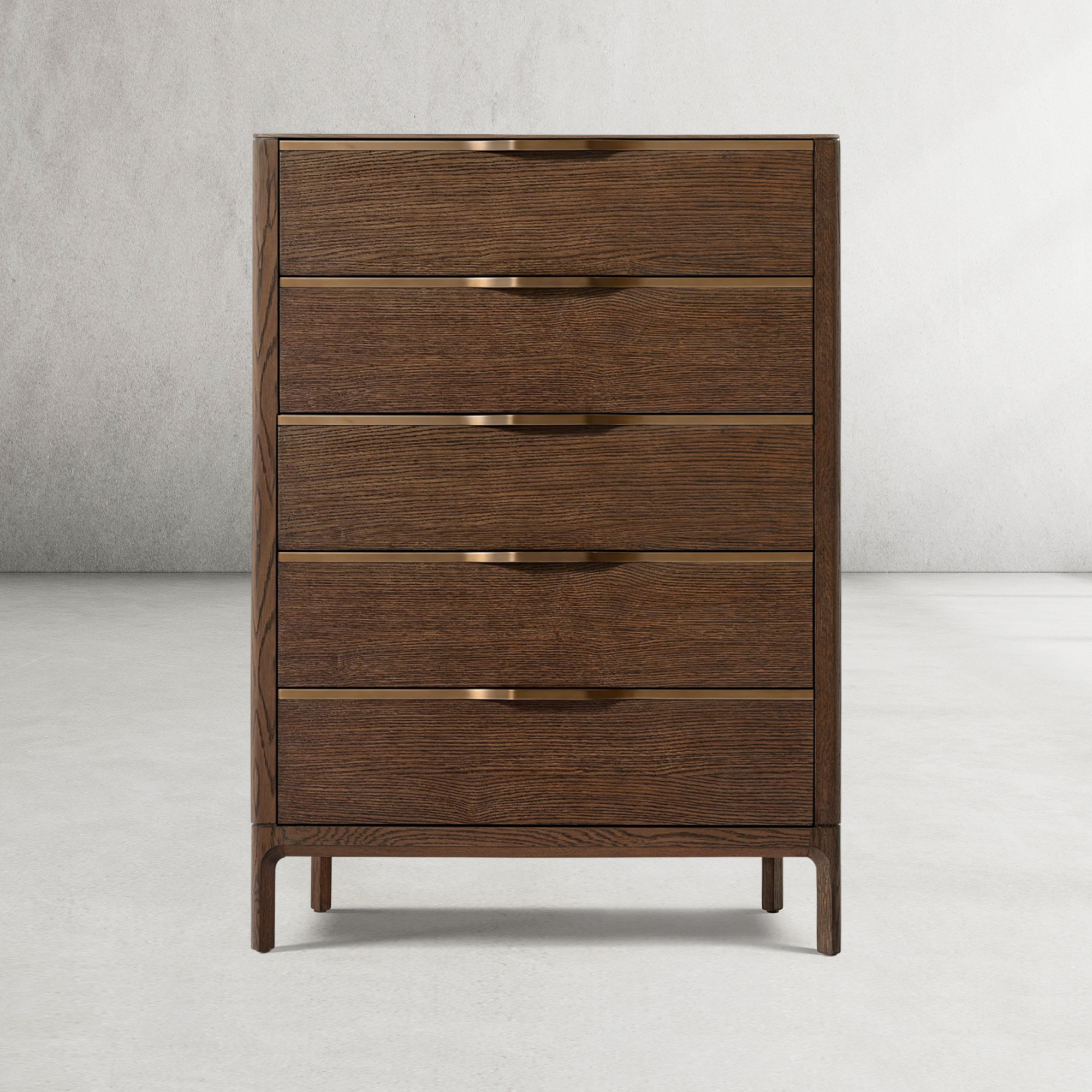 The Pada Drawer Dresser encapsulates minimalist elegance with its spare, sculptural design. Crafted from American oak veneers and accented with slender metal hardware, this piece beautifully balances straight lines and rounded corners, offering a sophisticated storage solution.
