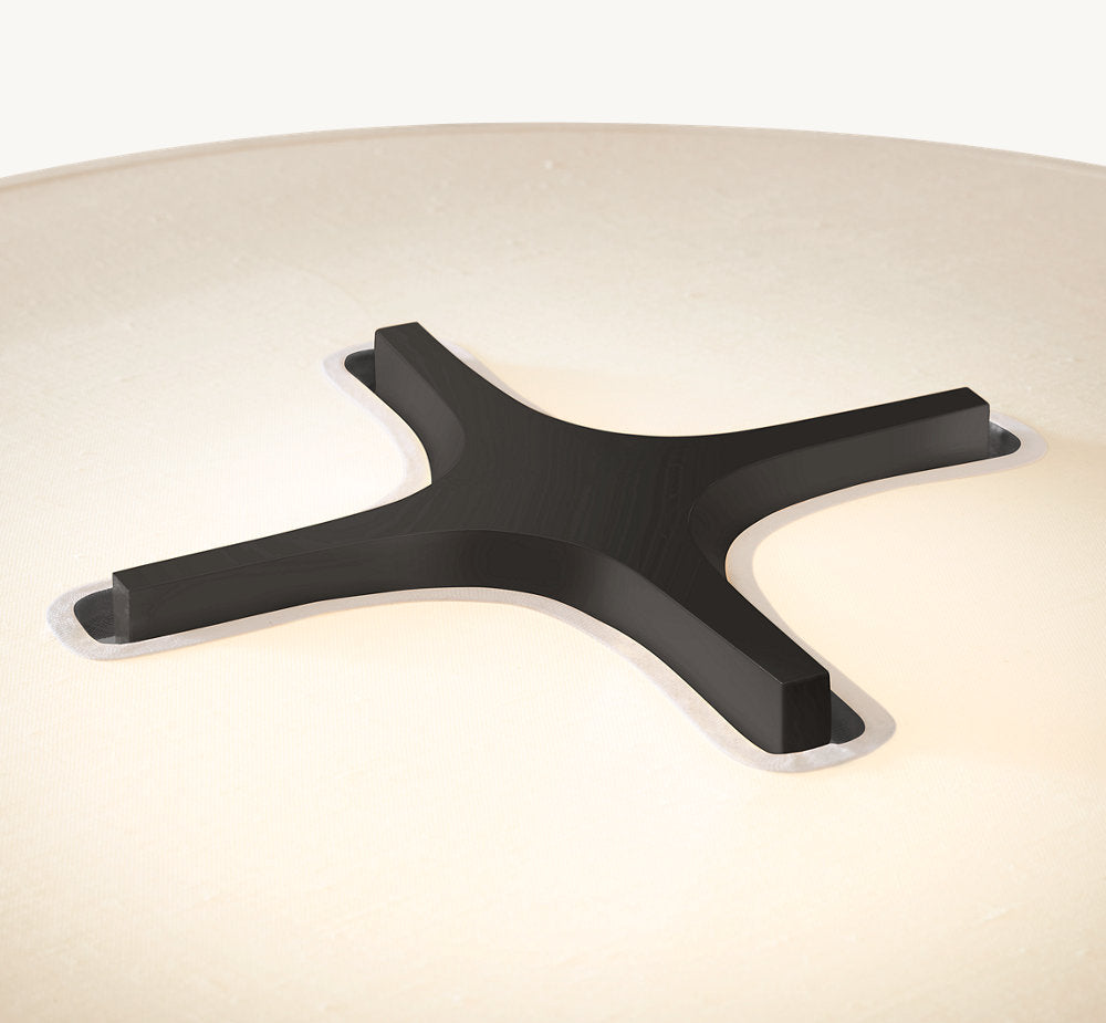 A unity of form and function, Paxton reimagines 1970s postmodern architecture. A sleek X-shaped column of burnished metal rises to meet a linen drum shade, conjoining mass and airiness, crisp angles and organic curves. The top of the column peeks through a cutout in the closed-top shade, offering restrained embellishment.