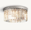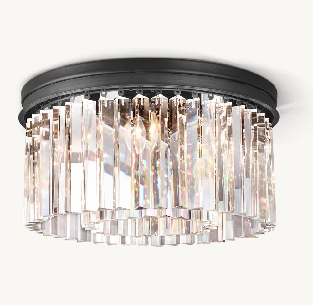 The Art Deco style born in 1920s Paris is evident in the straight-and-curved lines of our elegant lighting. Its optical-quality prisms, arranged in even, concentric rings, hang in sparkling harmony from an iron frame.