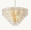 Inspired by 1950s Venetian fixtures of Murano, Italy, our chandelier combines traditional glassmaking craftsmanship and modernist style. A study in geometric repetition, ribbons of textured cast glass cascade in concentric rings, casting a warm glow to stunning effect.