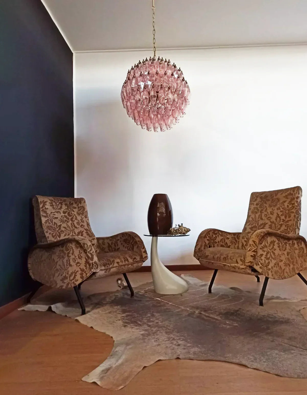 Spherical Murano Poliedri Pink Glass Chandelier, Transform your living space with the a stunning blend of artistic craftsmanship and luxurious design. Featuring Pink glass elements, Creates a warm and inviting ambiance, perfect for enhancing any room's decor, Add a touch of luxury to your home.