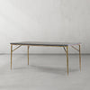 This rectangular dining table uses contrasting materials to create a unique industrial modern design. The solid wood countertop is supported by a slender vintage copper and iron frame for a transparent appearance.