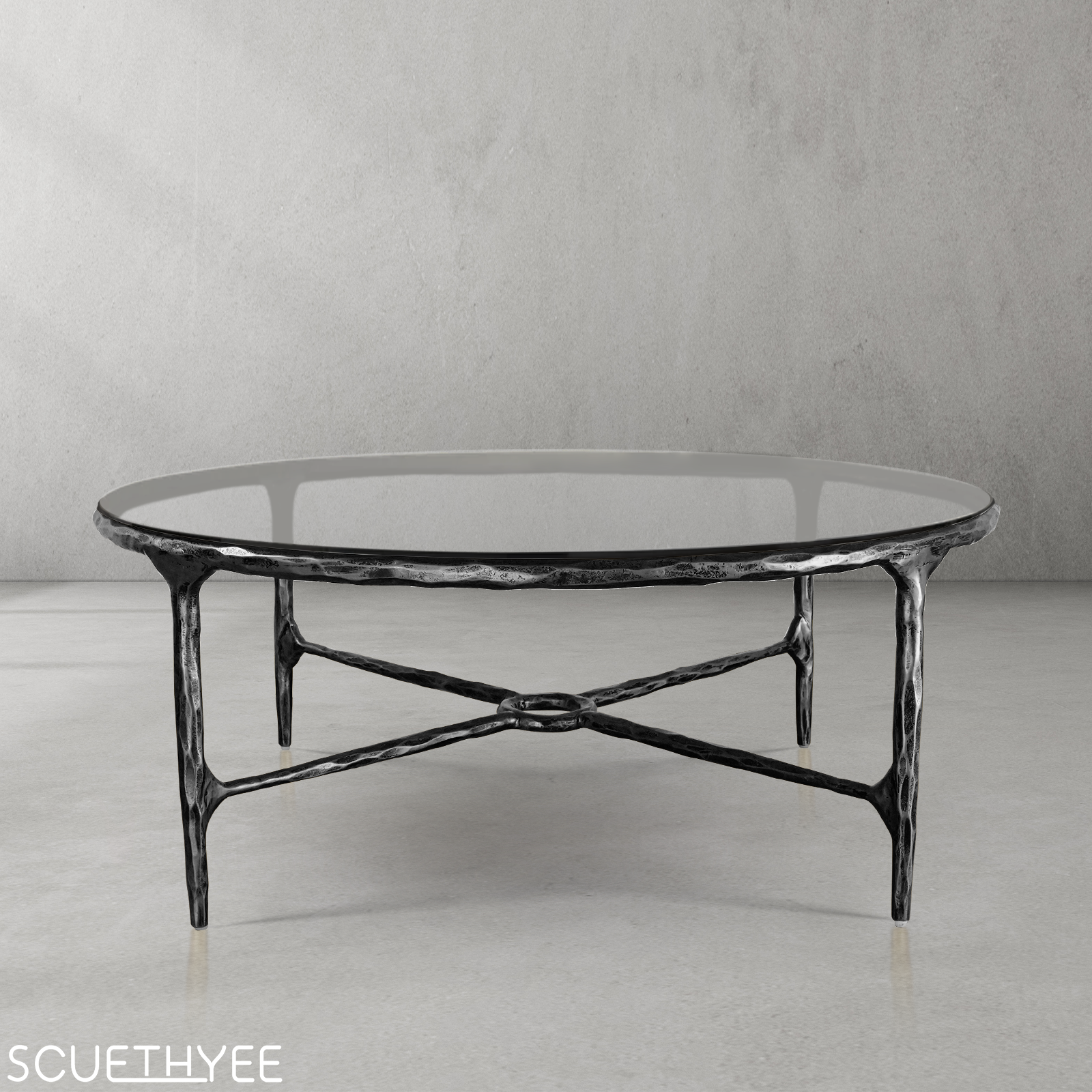 Our collection by the rustic sensibility of hand-forged metal with clean tempered glass. Employing an ancient fabrication process, artisans hand hammer the metal bars to reveal an alive, imperfect and organic texture. The pounded, tapered silhouettes are a rich counterpoint to the smooth, honed stone.