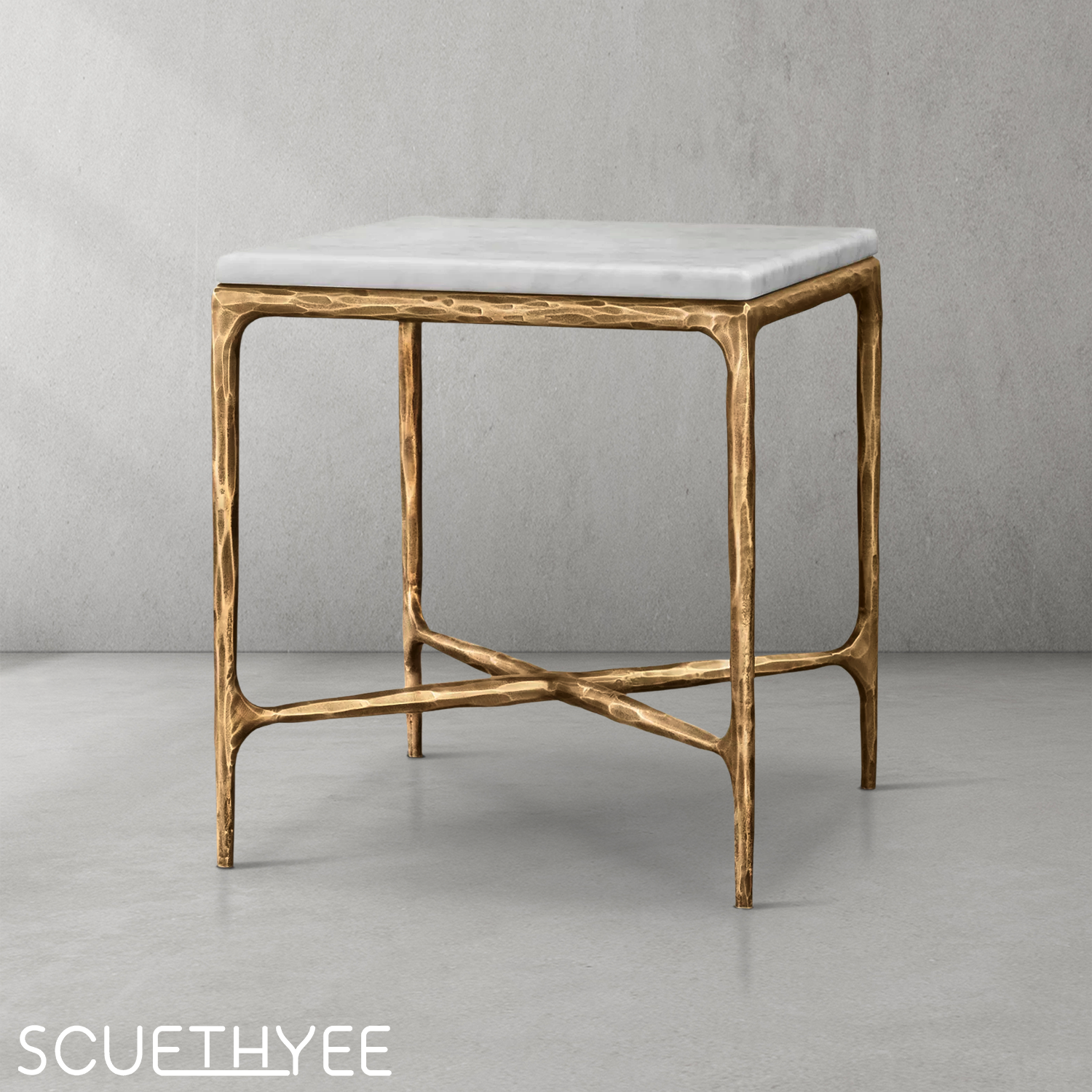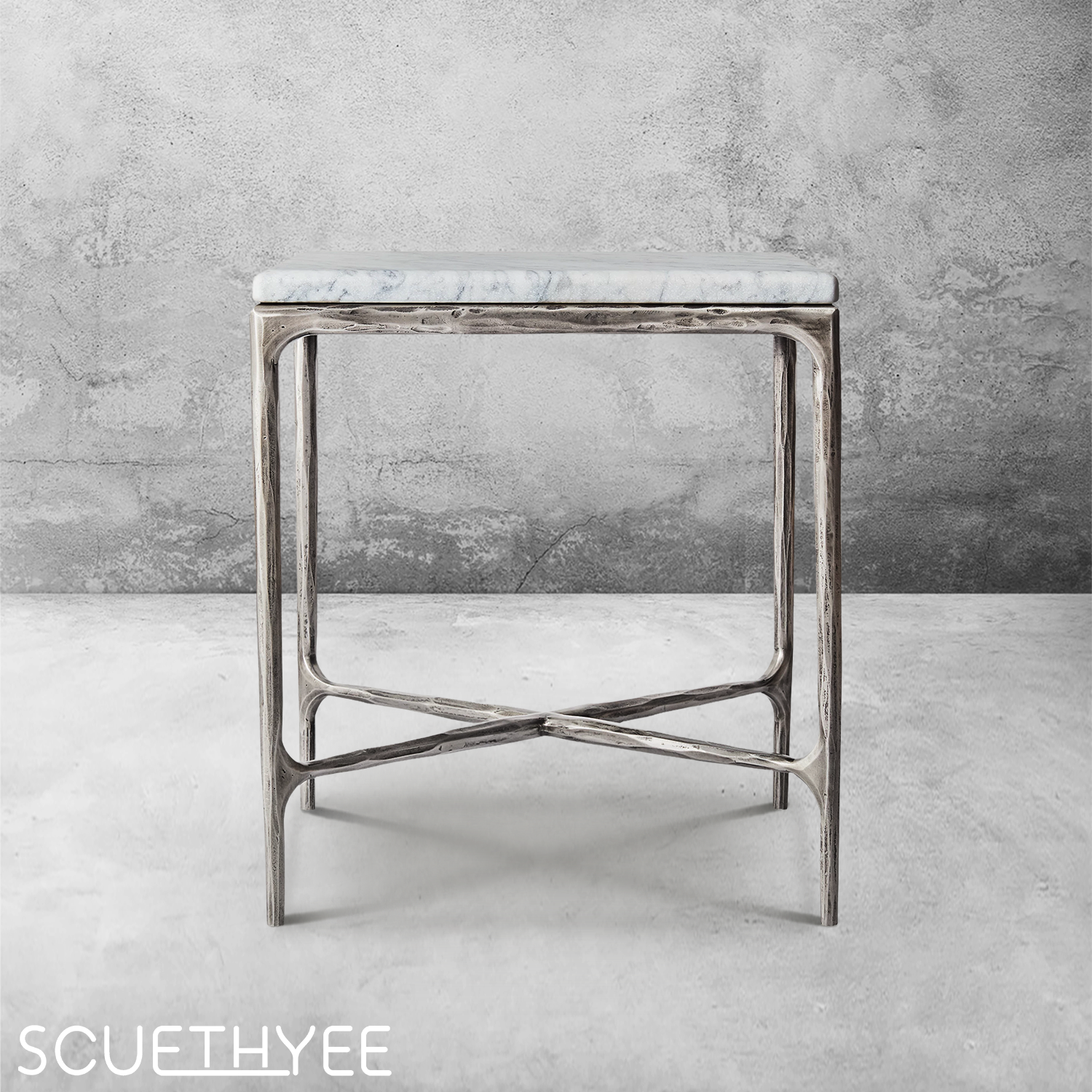 Inspired by the sculptural works of Salvador Dalí and Diego Giacometti, our collection by Julie Lawrence merges the rustic sensibility of hand-forged solid brass or solid stainless steel with cool Italian Carrara marble. Employing an ancient fabrication process, artisans hand hammer the brass bars to reveal an alive, imperfect and organic texture. The pounded, tapered silhouettes are a rich counterpoint to the smooth, honed stone.