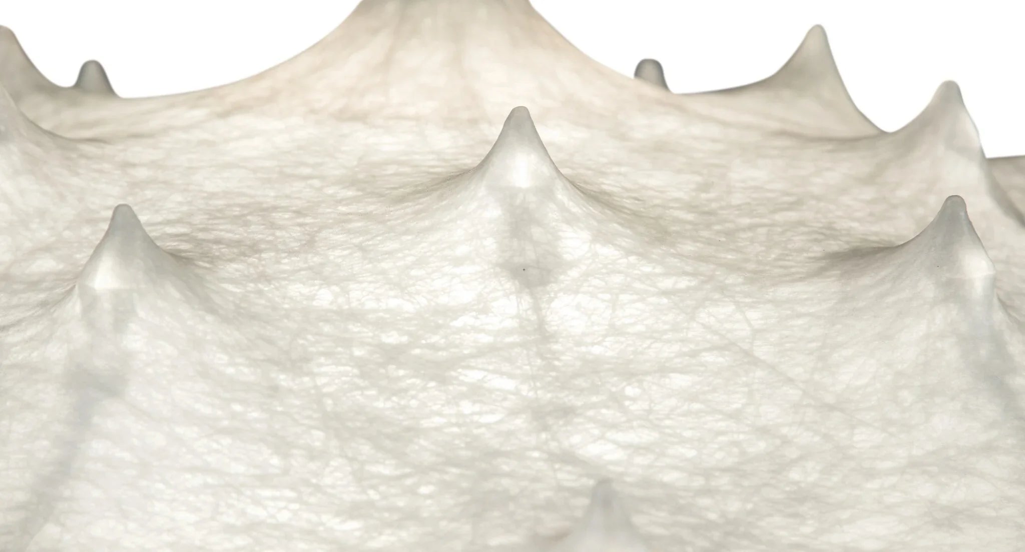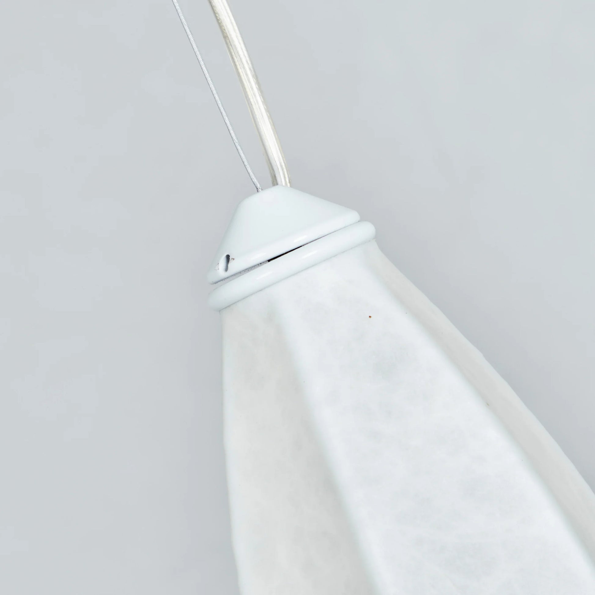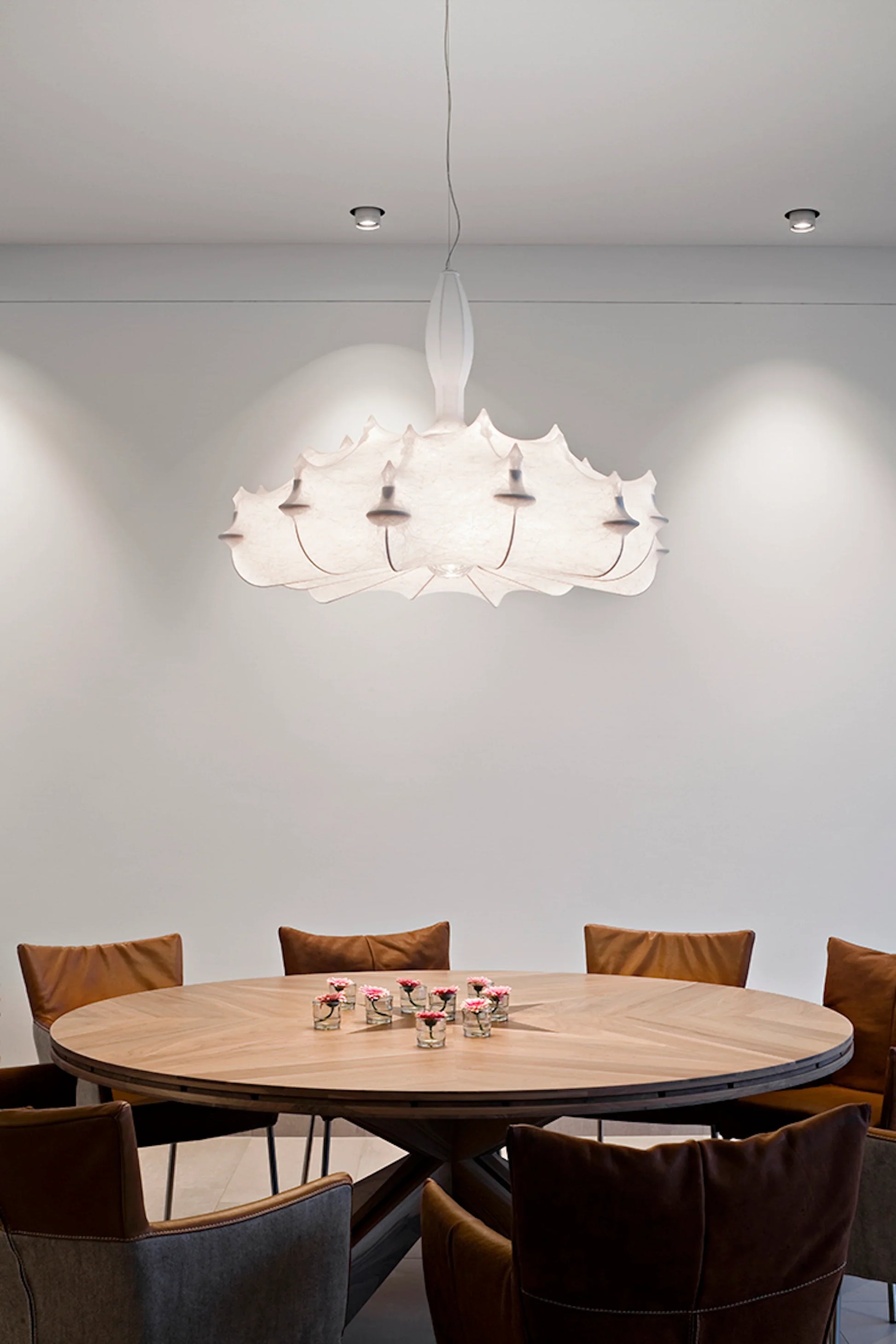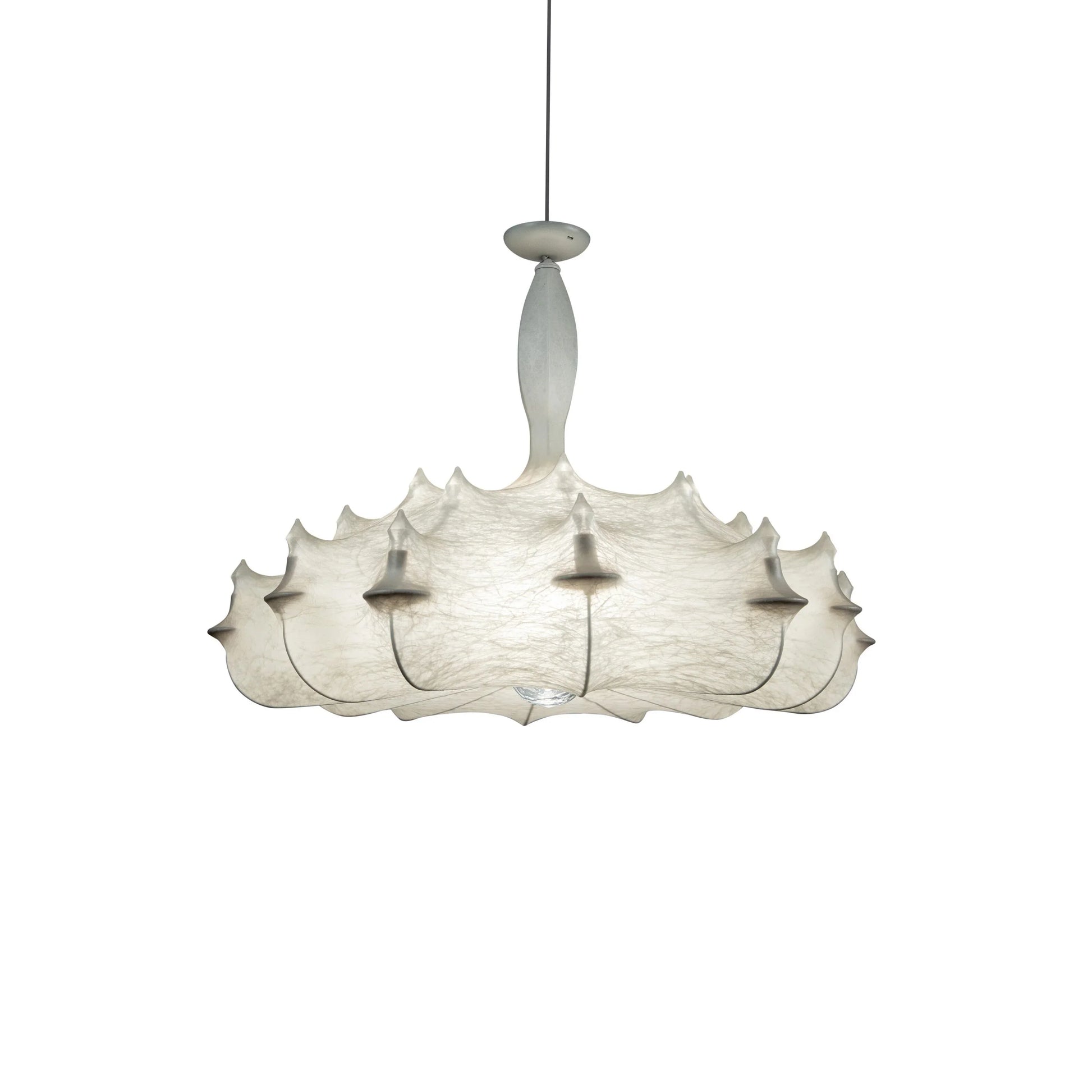Zeppelin chandelier provides diffused light. The white powder-coated interior steel structure is sprayed with a unique “cocoon” resin to create a diffuser, which is then protected by a clear spray finish. A faceted crystal ball located below the center creates a sparkling effect.
